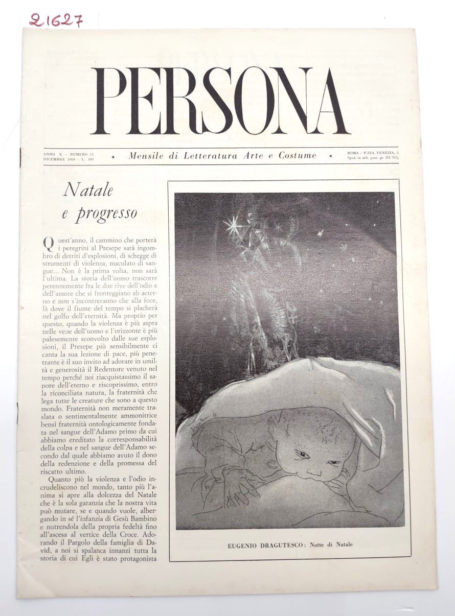 "Mensile di Letteratura Arte e Costume". La copertina presenta un'illustrazione di Eugenio Dragutescu, intitolata "Notte di Natale". L'articolo principale è intitolato "Natale e progresso". La rivista si presenta in condizioni accettabili, con i normali segni del tempo come leggere bruniture delle pagine, piccoli strappi marginali e lievi pieghe dimensioni cm 34 x 24,5