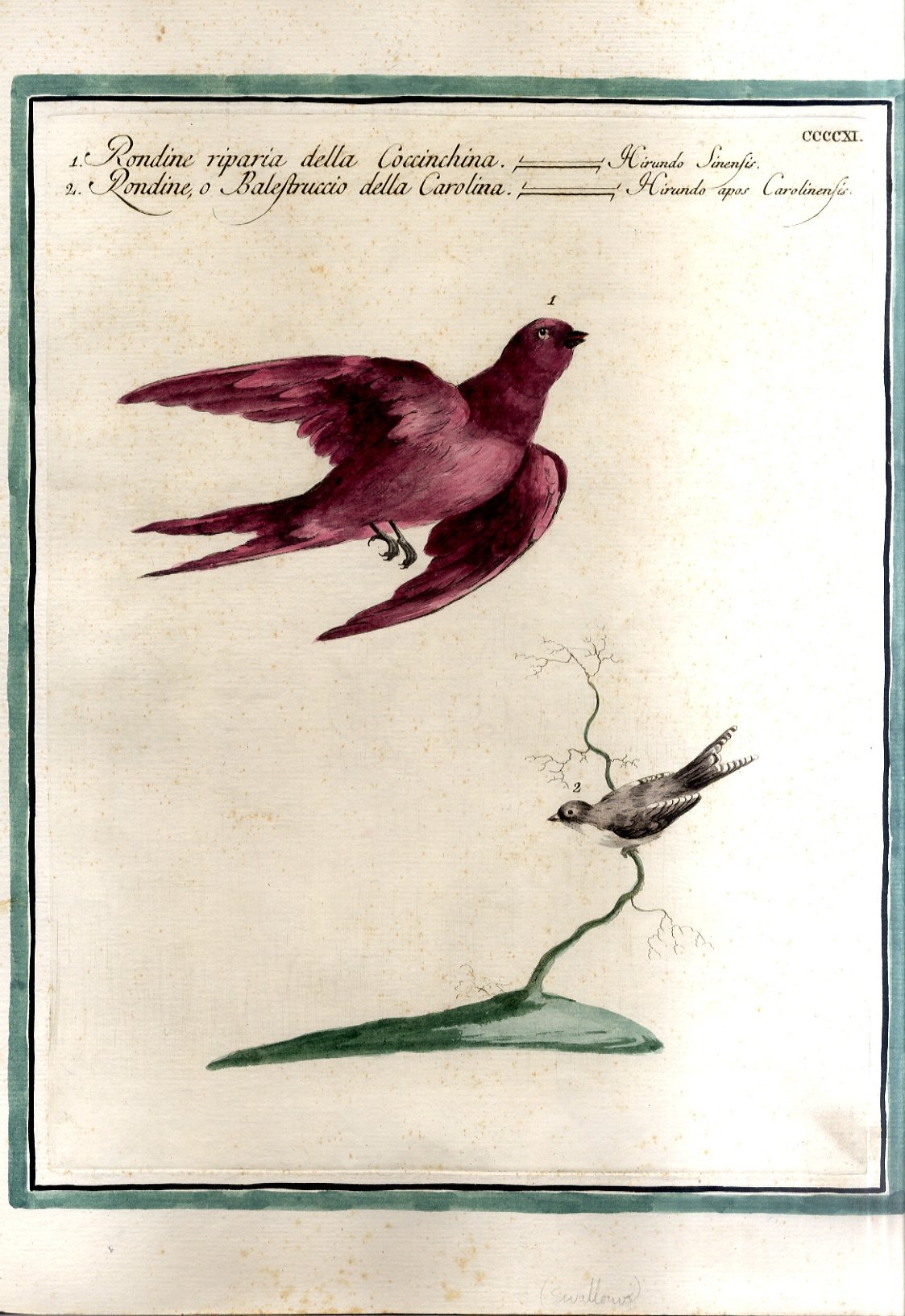 >Incisione originale in rame.cm 44,5 x 35. Splendida tavola numerata incisa in rame e finemente acquarellata da mano coeva. Tratta da "STORIA NATURALE DEGLI UCCELLI", a cura di Saverio Manetti, Lorenzo Lorenzi e Violante Vanni, 1771-1776.