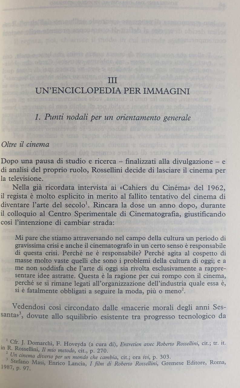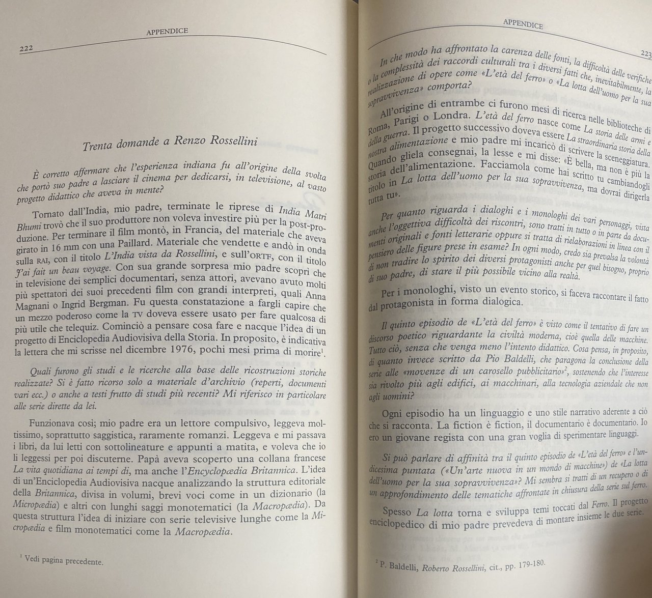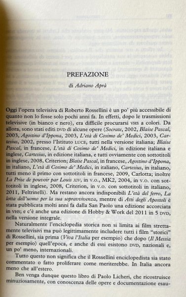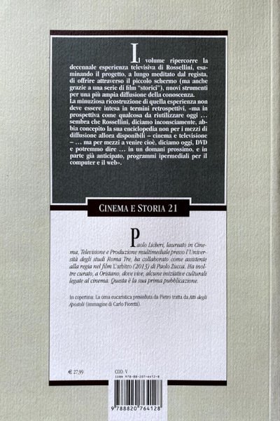The volume traces the decades of television experience by Rossellini, examining the project, long pondered by the Director, to offer through the peak screen (but also with a historical film series) new tools for a wider dissemination of knowledge. The meticulous reconstruction of that experience should not be understood in retrospective terms, but in perspective as something to reuse today, looks like Rossellini, say unconsciously, he conceived his encyclopedia not for the media then available-film and television, but for the media to come that is, let's say today, DVD and we could say tomorrow next, and partly already anticipated Hypermedia programs for your computer and the web.