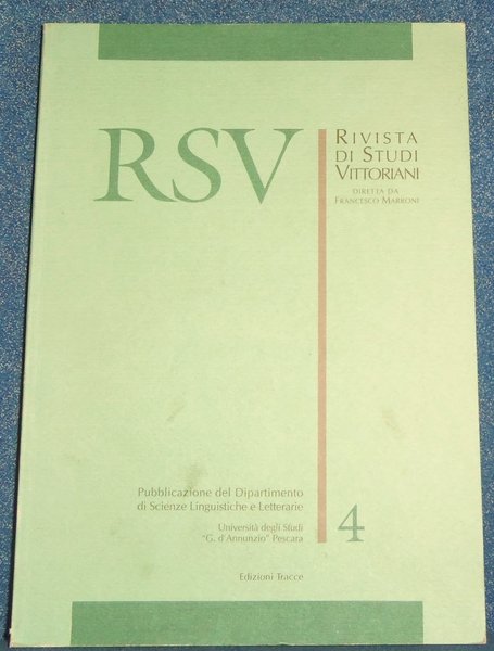 [Letteratura] (cm. 24) Brossura editoriale, -pp.202 Ë il IV fascicolo della rivista stampata con il contributo del Dip. Scienze Linguistiche e Letterarie dell'Universit‡ degli studi "G. D'Annunzio" di Chieti, e con la collaborazione scientifica del CUSVE di Pescara. Marroni Ëil direttore nella rivista. Questo numero contiene 4 saggi in lingua inglese e 5 contributi, dei quali 2 in italiano, gli altri in inglese. Tracce di polvere alla brossura, internamente perfetto. 9 articles on Victorian literature. 7 essays are in English and 2 are in Italian. [n11]