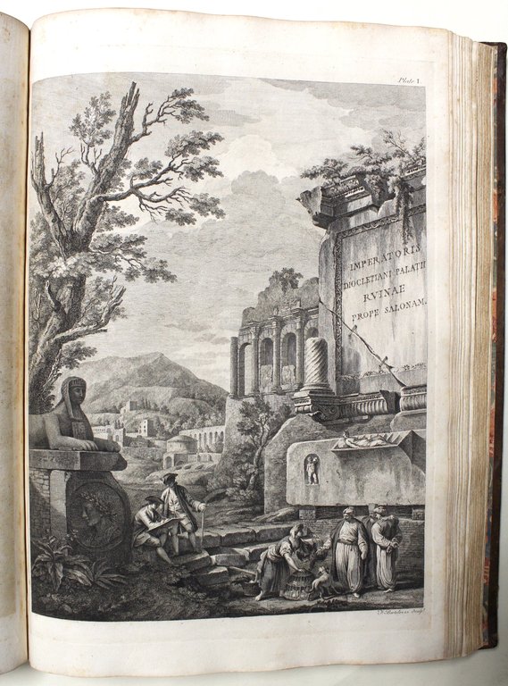 In folio (mm 530x370); pagg. IV, (8), 33 (dedica al Re Giorgio III, lista dei sottoscrittori, introduzione, descrizione delle tavv.); frontespizio (tav. 1) inciso finemente in rame da Francesco Bartolozzi. Piena pelle coeva, dorso con sette nervi, titolo in oro su doppio tassello in rosso e nero, scomparti con ricchi fregi dorati. Piatti con doppio riquadro a merletto e cantonali in oro. Tagli e dentelle dorati.<BR>L'apparato iconografico di questa magnifica opera è il frutto di un atelier di insigni artisti italiani in collaborazione con altrettanti famosi intagliatori europei dell'epoca; le tavole sono stampate su carta forte con marca d'acqua (giglio fiorentino), tratte dai disegni per lo piu' di Charles-Louis Clerisseau, ed incise a Venezia elegantemente in rame da Bartolozzi, Zucchi, Santini, Rooker, Patton, Walker, Mazell, Basire e Cuneo. Si tratta di 61 incisioni in rame numerate, di cui 7 a doppia pag. e 7 più volte ripieg. Complessivamente 14 sono vedute, incluso il frontespizio, fra cui una a doppia pag. "General plan of the town and fortifications of Spalatro."; Spalato; Porta Aurea; Porta Ferrea; Crypto-Porticus; peristilio del Palazzo; interno del Vestibulum; tempio di Jupiter; entrata e interno di questo tempio; l'acquedotto; tempio di Aesculapius; le restanti tavole sono la summa descrittiva dei fregi e componenti architettonici del palazzo: piante, spaccati, sezioni, bassorilievi, particolari, archivolti, consoles, porte, capitelli, fregi, cornici, la sfinge, ecc. <BR>Prima edizione di questa rara e affascinante opera di difficile reperibilità a trovarsi completa. <BR>L'autore architetto scozzese (1728- 1792), uno dei maggiori esponenti del Neoclassicismo; per Adam l'adozione delle forme classiche nonché tutti gli elementi che possono essere rielaborati e riproposti nella progettazione e arredo delle moderne abitazioni, passò attraverso la diretta riscoperta dell'antichità e delladecorazione romana e pompeiana. Si dedicò a quest'opera dopo aver intrapreso un viaggio nel 1757 a Spalato in compagnia del celebre artista francese Clerisseau, che lo accompagnò per disegnare le rovine del palazzo di Diocleziano. Questo lavoro, come precisa Adam, è " la prima casa di abitazione privata romana ad essere illustrata e descritta".<BR>Ottimo esemplare, lievissime ossidazioni marginali. <BR>Provenienza: John Peyto Verney, Lord Willoughby de Broke; Robert John Verney, Lord Willoughby de Broke.<BR>Fowler Collection, n. 2. "are of interest not only as fine examples of architectural engraving but as showing the source of some of the motives of the Adam style. The frontispiece, a composition of ruins and landscape with figures, is by F. Bartolozzi"<BR>Cicognara,3567: "Opera magnifica e grandiosa ove forse con soverchia liberta' l'arte del disegnatore aggiunse bellezza ad opere scolpite nel momento della decadenza delle arti"; Brunet, I, 46: "ouvrage bien execute, peu commun"; Berlin Cat.,1893; Diz. Treccani,I, p. 96 "L'architetto Robert Adam (Edimburgo 1728 - Londra 1792) viaggiò durante 4 anni, visitando specialmente l'Italia ove conobbe Piranesi. A Spalato eseguì studi e disegni delle rovine del Palazzo di Diocleziano e li pubblico' nel 1764. Tornato in patria, dal 1764 al 1768 fu architetto di Giorgio III e della regina. Esegui' numerosi lavori per la trasformazione o la costruzione di palazzi signorili sia a Londra che fuori della capitale (con il castello di Culzen anticipo' il gusto del secolo successivo per il finto gotico). Lo stile di Adam, per l'abile applicazione alle tradizioni inglesi dei motivi importati dalla Grecia e da Roma, costituisce una delle prime e più riuscite attuazioni del neoclassicismo".<BR>Graesse I p. 18; Valentinelli, Bibl. delle Dalmazia e del Montenegro p. 158.<BR><BR><BR>