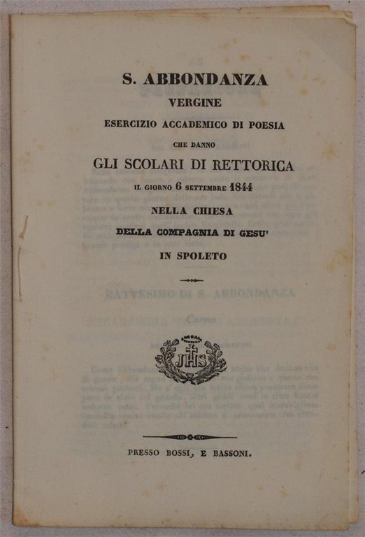 S. ABBONDANZA VERGINE ESERCIZIO ACCADEMICO DI POESIA CHE DANNO GLI SCOLARI DI RETTORICA IL GIORNO 6 SETTEMBRE 1844