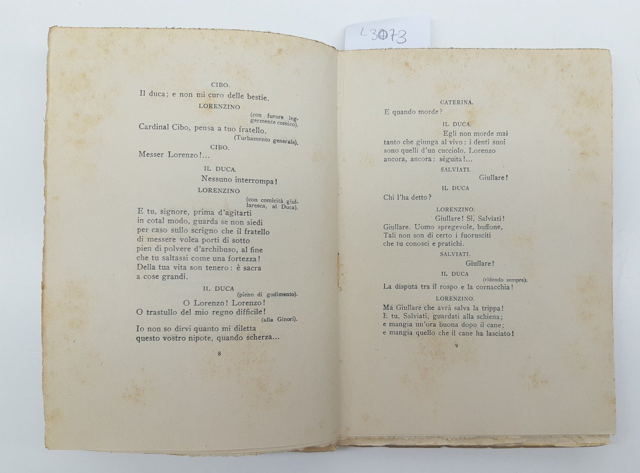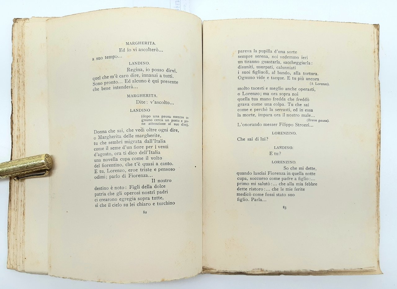 legatura morbida editoriale in precarie condizioni, fioriture e bruniture diffuse ai piatti e al dorso, libro deformato al dorso, piccole pieghe e strappi ai margini dei piatti e del dorso, tagli irregolari bruniti, firma di possesso al piatto anteriore all'antiporta e al frontespizio, timbro all'antiporta e al frontespizio, legatura molto allentata, fioriture diffuse alle pagine interne che non ostacolano la lettura, numero pagine 124 dimensioni in cm 20 x 14,5