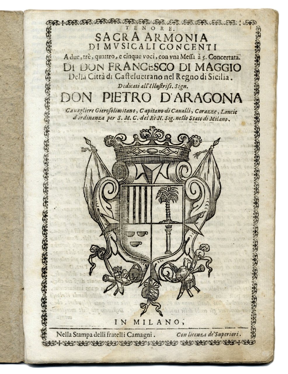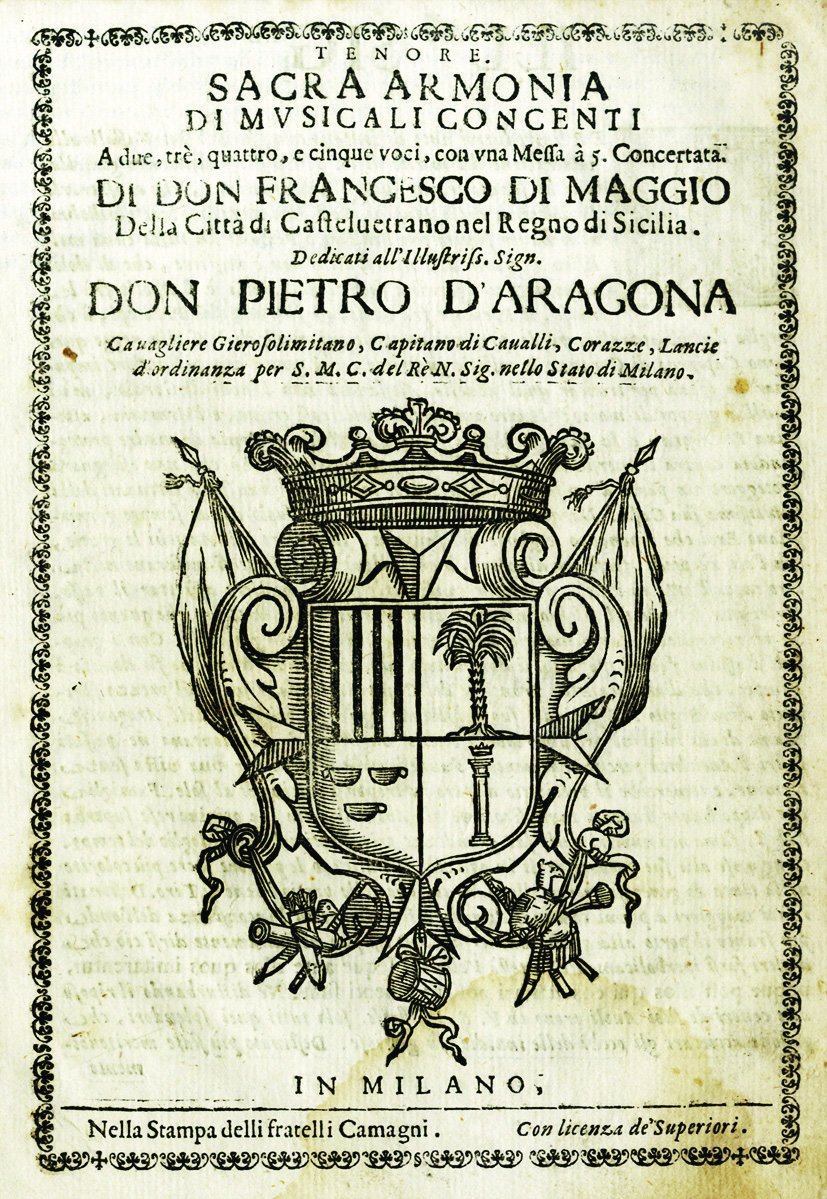 >in-4, pp. (4), 38 di notazioni musicali con testo. Copertina originale in cartoncino rustico, dorso rinforzato in carta decorata. Al frontespizio grande stemma di Pietro d'Aragona, "Capitano di cavalli ... nello stato di Milano", dedicatario del volume. Prima ed unica edizione della sola parte di Tenore. Rarissimo, un solo esemplare in 6 parti è censito presso il Royal College of Music di Londra. E' l'unica opera conosciuta di Francesco Di Maggio, nativo "della città di Castelvetrano nel Regno di Sicilia" ultimo rappresentante della scuola polifonica siciliana, dopo Pietro Vinci, Antonio Il Verso, Giuseppe Palazzotto Tagliavia. In ottime condizioni (lievissimo alone nel margine inferiore). British U.C. of early music II, 642. Eitner VI, 274-5. Fétis V, 401. Rism, 5-331.