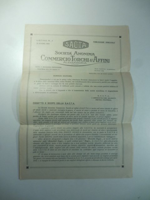 Sacta. Societa' anonima Commercio torchi & affini, Alessandria. Bifoglio pubblicitario
