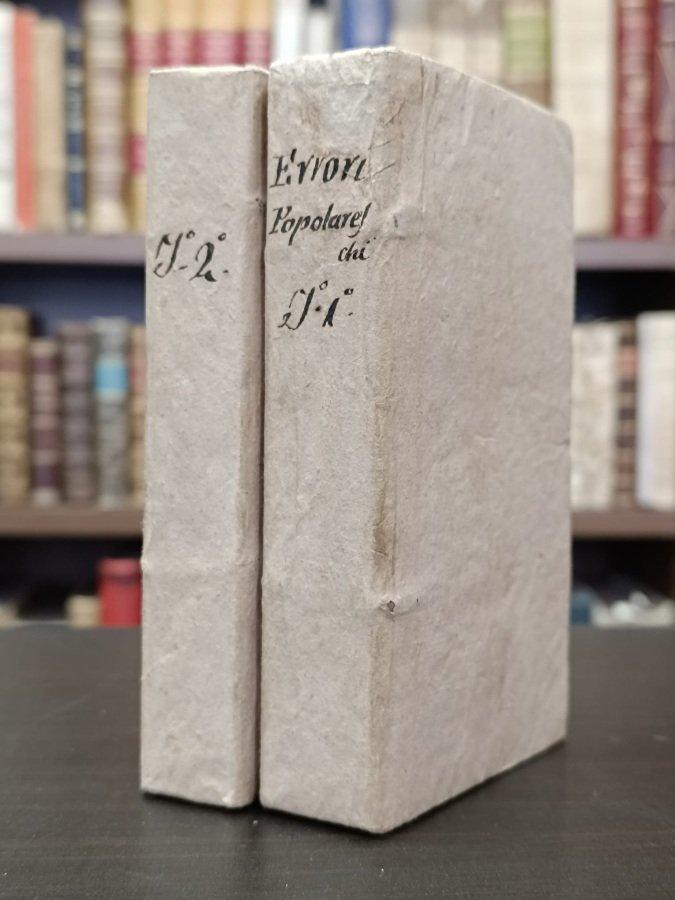 2 volumi in-12° (cm. 15), brossure coeve con titoli anticamente manoscritti ai dorsi; pp. XX 416, VIII 432 in ottimo stato (lievissime e sporadiche fioriture, frontespizio del vol. I controfondato). Selvaggio Canturani è lo pseudonimo di Arcangelo Agostini, noto soprattutto come traduttore dal francese di opere di erudizione e storia ecclesiastica. In questo interessante volume vengono illustrate prima le cause che stanno all'origine delle false credenze; si passano poi in rassegna le errate convinzioni in materia di botanica, zoologia, antropologia, iconologia, cosmografia, storia e religione. Cfr. Mazzucchelli I, 210; Melzi III, 49. Non comune. Esemplare molto buono. (NN1)