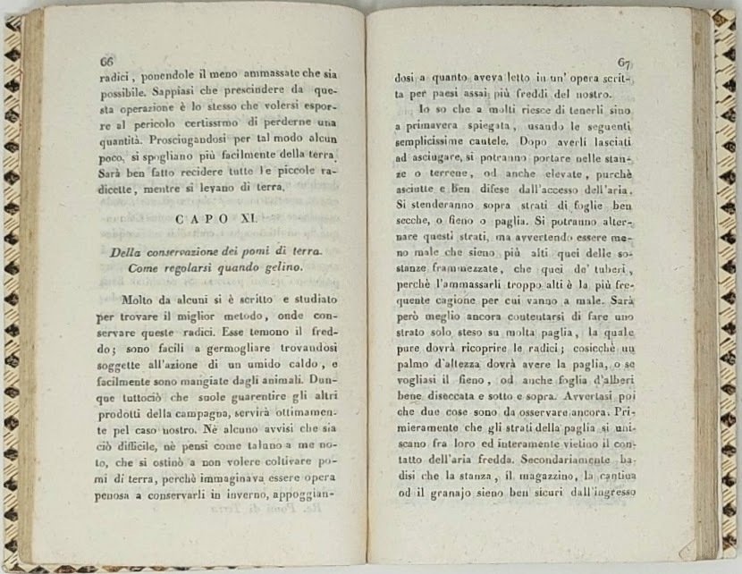> in-8 (mm 187x110). Pagine (4]) 156. Brossura moderna in carta decorata. Prima edizione del saggio dedicato alla patata e alla sua coltivazione dal celebre agronomo, che già negli Elementi di Agricoltura aveva inserito alcune avvertenze “le più acconcie a procurare una buona quantità di queste radici” (p. 2). Re traccia anche una storia del ‘pomo di terra', e delinea alle pp. 10-26, quella che può a ragione essere considerata la prima rassegna bibliografica dedicata all'argomento. Buon esemplare. Bruniture, tracce di sporco e alone al frontespizio. Al frontespizio la nota di possesso coeva ‘G. Rosella P.ne', alla cui mano sono da attribuire le note marginali al testo. Alcune note al frontespizio, di due diverse mani. Paleari Henssler 409; Marciana 1381; B.IN.G. 1621; C. Benporat, La patata nella cultura alimentare italiana, “Appunti di Gastronomia”, 20 (1996), p. 88.
