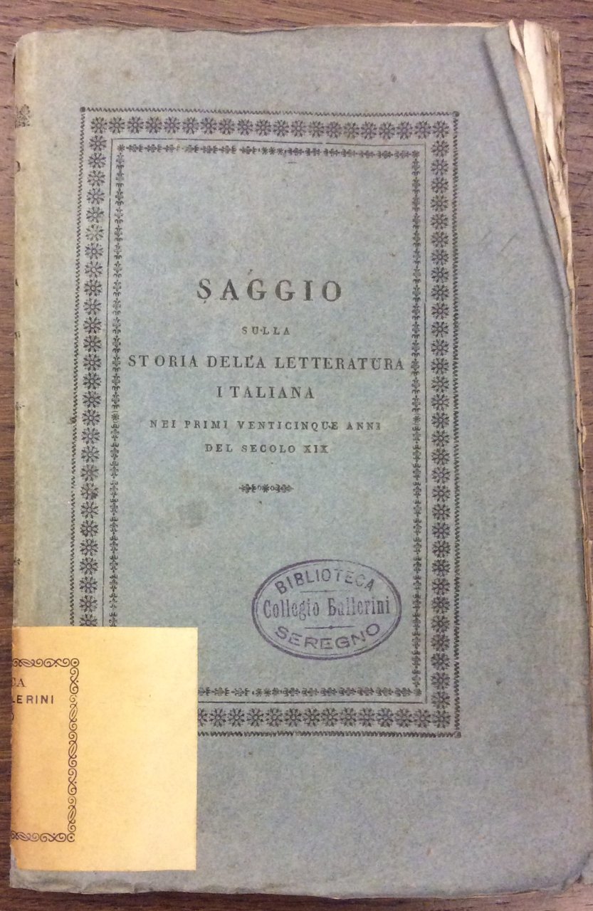 SAGGIO SULLA STORIA DELLA LETTERATURA ITALIANA NEI PRIMI VENTICINQUE ANNI DEL SECOLO XIX. - Opera di A. L.