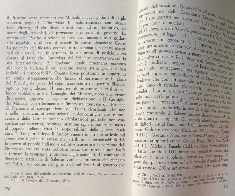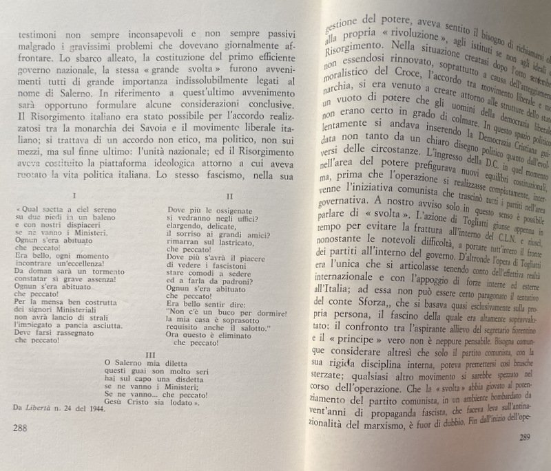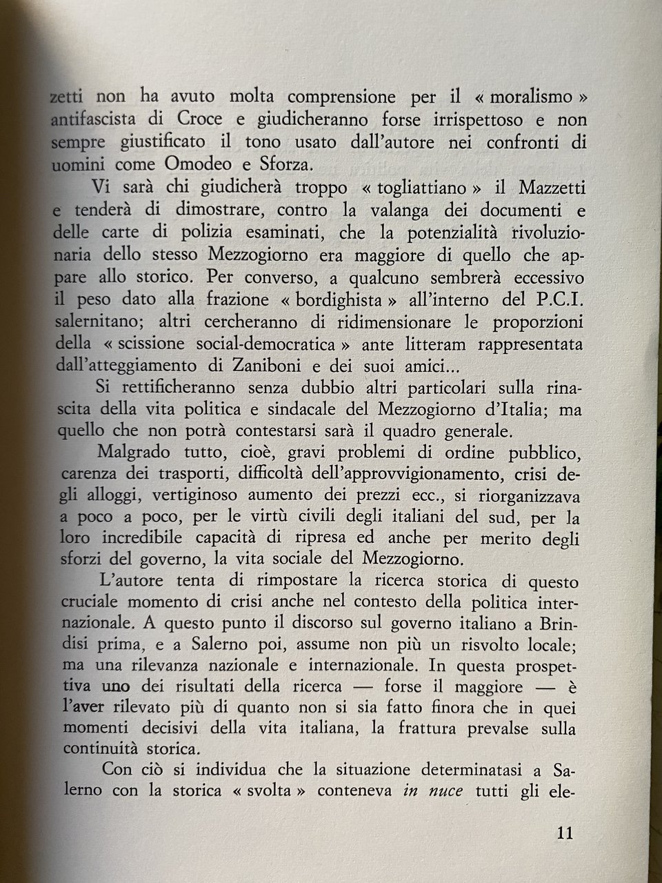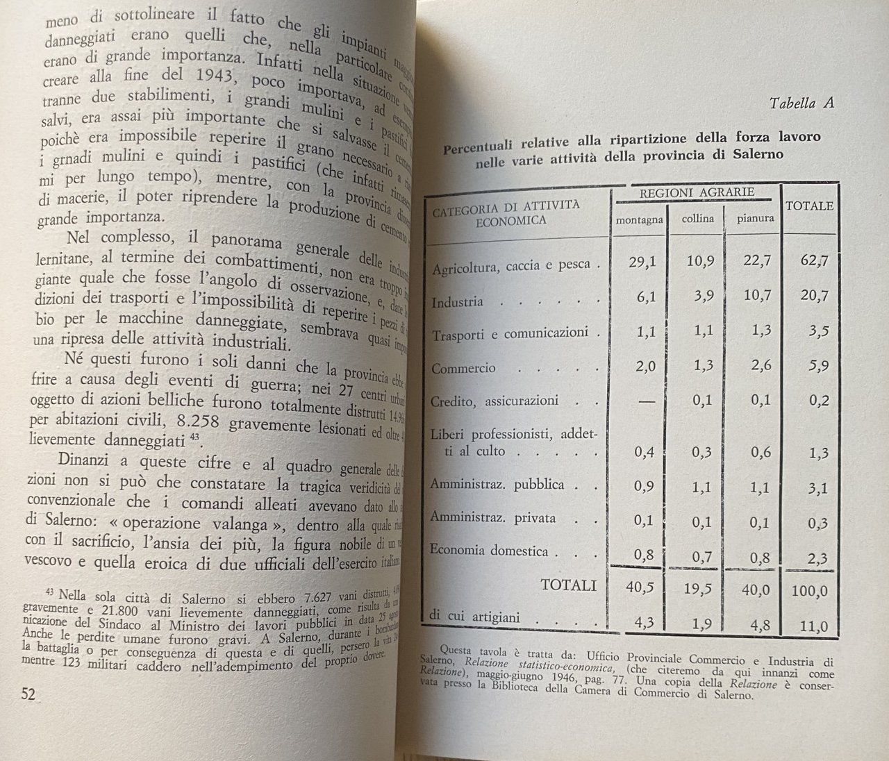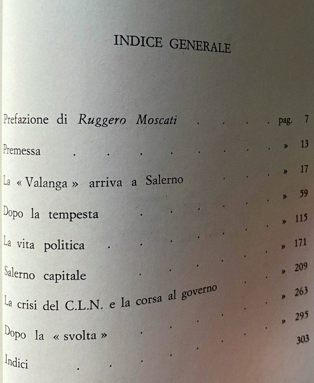 Soggetti: Storia regionale locale e nazionale, Storia contemporanea, Novecento, Storiografia liberale, Seconda Guerra Mondiale, Fascismo, Armistizio, 8 Settembre, Rosario Romeo, Storia militare, Sbarco angloamericano, Salerno, 1943, Politica, Governo, Capitale, Renzo De Felice, Alleati, Americani, Germania, Nazismo, Tedeschi, Resistenza, Libertà, Esercito, Gran Bretagna, Winston Churchill, Benito Mussolini, Re d'Italia, Vittorio Emanuele III, Diplomazia, Burocrazia, Amministrazione Militare Alleata, Economia, Mercato nero, Prezzi, Italia del Sud, Monarchia, 1944, Sede provvisoria, Brindisi, Esecutivo, Agropoli, Carlo Alfani, Territori liberati, Occupazione tedesca, Sottosegretari, Brindisi, Regno del Sud, Decreti, Pietro Badoglio, Potenza, Bari, Umberto di Savoia, Africa, A. Carucci, CLN, Comitato di Liberazione nazionale, Svolta, Tito Zaniboni, Partito comunista, Palmiro Togliatti, Carlo Sforza, Gioacchino Volpe, Mac Mason Farlane, Amedeo Maiuri, Danilo Mannucci, Kesserling, Marxismo, Battaglie sindacali, Sinistra, Fascisti, Lavoro, Quotidiani, Notizie, Cronache, Fonti storiche, Diari, Memorie, Stampa, Editoria, Quotidiani, Nicola Monterisi, Galeazzo Ciano, Harold MacMillan, Nicola Oddati, Francesco Saverio Nitti, Adolfo Omodeo, Mario Parrilli, Ora del Popolo, Azione, L'Avanti, Repubblica di Salò, Dino Philipson, Raffaele Petti, Papa Pio XI, Chiesa, Giulio Rodinò, Vito Reale, Angelo Jervolino, Hull Cordell, Giuseppe Laterza, Lauria, Pasquale Villani, Ugo Spirito, Tito, Aliotta, Amendola, Vincenzo Arangio Ruiz, Ivanoe Bonomi, Girolamo Bottiglieri, Amadeo Bordiga, Luigi Cacciatore, Francesco Caracciolo, Arturo Carucci, Ippolito Ceriello, Cavour, Adolfo Cilneto, Giovanni Cuomo, D'Aniello, Benedetto Croce, Generoso Crisci, Olivier Cromwell, Agostin Degli Espinosa, Gabriele De Rosa, Sartori, Eisenhower, Charles De Gaulle, Andrea Galdo, Nicola Gallerano, Gazzetta del Mezzogiorno, Meridionalismo, Giovanni Gentile, Giolitti, Roberto Capa, Tina Giordano, Hitler, Kesserling, Rappresaglie, Eccidio, Grimaldi, Marino, Gonzaga, Bruno Spampanato, Agricoltura, Commercio, Merci, Prodotti agricoli, Raccolti, Grano, Mais, Avena, Olio, Frutta, Ortaggi, Calmiere, Regolamento, Prezzario, Negozi, Ordine, Approvvigionamento, Crisi, Alloggi, Ricostruzione, Industria, Trasporti, Fabbriche, Ricambi, Bombardamenti, Danni, Inflazione, Socialisti, Comunisti, Lotta di classe, Elezioni, Referendum, Repubblica, Costituzione, Costituente, Raimondo Craveri, Antifascismo, Ebrei, Antisemitismo, Leggi razziali, Persecuzioni, Deportazioni, Deportati, Intellettuali, Dissenso, Consenso, Propaganda, Critica, Prefetto, Disoccupazione, Operai, Contadini, Donne, Vita quotidiana, Epicarmo Corbino, Alimentazione, Carestia, Cibo, Produzione, Scuola, Ripresa economica, Boom, Comunicazione, Prestatori d'opera, Armamenti, Armi, Collaborazionisti, Magistero, Magistratura, Processi, Amnistia, Luigi Sturzo, Concordato, CGL, Sindacati, Scioperi, Sindacalismo, Diritti sociali civili, Quattro giornate, Napoli, Campania, Meuccio Ruini, Alberto Cianca, Giuseppe Saragat, Alcide De Gasperi, Alfonso Menna, Raito, Vietri sul Mare, Silvio Bertoldi, Controstoria, A. Placanica, Istituzioni, Società, Studi universitari, Scuola Medica Salernitana, Università, Francesco De Sanctis, Raffaele Guariglia, Palazzo Pinto, Palazzo Natella, Luogotenente Generale, Riferimento, Saggi storici, Consultazione, Collezionismo, Libri rari Vintage fuori catalogo, Bibliografia, Quinta Armata, Thomas Aloysius Lane, Autorità, Questione alimentare, Razionamento, Pane, Stato, Democrazia, Poste e Telegrafi, Presidente del Consiglio dei Ministri, Democrazia Cristiana, Monsignor Monterisi, Opposizione, Parrilli, Roosevelt, Fazioni, Sarno, Esercenti, Truppe, Esuli, Legalità, Estremismo bordighista, l'Unità, Trotzkismo, Disciplina, Eugenio Reale, Regional and national history, Contemporary history, Twentieth century, Liberal historiography, Second World War, Fascism, Armistice, September 8, Military history, Anglo-American landing, Politics, Government, Capital, Allies, Americans, Germany, Nazism, Germans, Resistance, Freedom, Army, Great Britain, King of Italy, Victor Emmanuel III, Diplomacy, Bureaucracy, Allied Military Administration, Economy, Black Market, Prices, Southern Italy, Monarchy, Temporary Headquarters, Brindisi, Executive, Agropoli, Liberated Territories, German Occupation, Undersecretaries, Southern Kingdom, Decrees, Savoy, National Liberation Committee, Turning point, Communist Party, Union battles, Left, Fascists, Labour, Newspapers, News, Chronicles, Historical sources, Diaries, Memoirs, Press, Publishing, Newspapers, Pope Pius XI, Church, Southernism, Reprisals, Massacre, Agriculture, Commerce, Goods, Agricultural products, Crops, Wheat, Corn, Oats, Oil, Fruit, Vegetables, Calmer, Regulation, Price list, Shops, Order, Supply, Crisis, Lodgings, Reconstruction, Industry, Transport, Factories, Parts, Bombing, Damage, Inflation, Socialists, Communists, Class Struggle, Elections, Republic, Constitution, Constituent Assembly, Anti-fascism, Jews, Anti-Semitism, Racial Laws, Persecutions, Deportations, Deportees, Intellectuals, Dissent, Consent, Criticism, Prefect, Unemployment, Workers, Peasants, Women, Daily life, Epicarmo Corbino, Nutrition, Famine, Food, Production, School, Economic recovery, Communication, Workers, Armaments, Arms, Collaborators, Magisterium, Judiciary, Trials, Amnesty, Concordat, Unions, Strikes, Syndicalism, Civil social rights, Four days, Naples, Counterhistory, Institutions, Society, University studies, Medical School, University, Lieutenant General, Reference, Historical essays, Consultation, Collecting, Out-of-print rare books, Bibliography, Fifth Army, Authority, Food question, Rationing, Bread, State, Democracy, Post Telegraph, President of the Council of Ministers, Christian Democracy, Opposition, Factions, Merchants, Troops, Exiles, Legality, Extremism, Unity, Trotskyism, Discipline