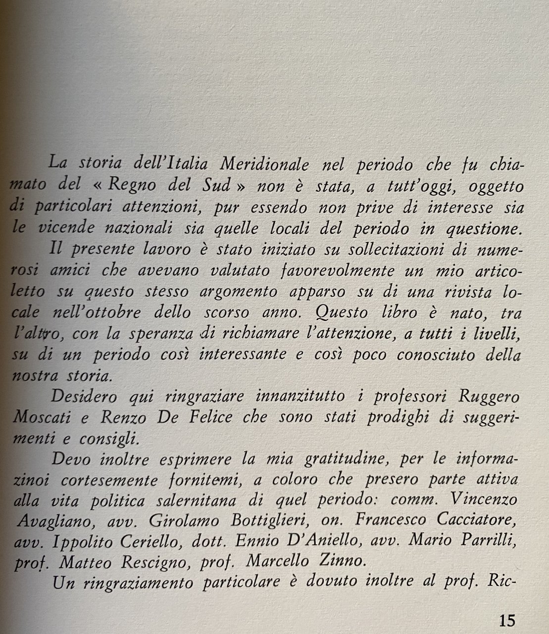 Devo inoltre esprimere la mia gratitudine, per le informazioni cortesemente fornitemi, a coloro che presero parte attiva alla vita politica salernitana di quel periodo: comm. Vincenzo Avagliano, avv. Girolamo Bottiglieri, on. Francesco Cacciatore, avv. Ippolito Ceriello, dott. Ennio D'Aniello, avv. Mario Parrilli, prof. Matteo Rescigno, prof. Marcello Zinno. Un ringraziamento particolare è dovuto inoltre al prof. Riccardo Avallone. ...