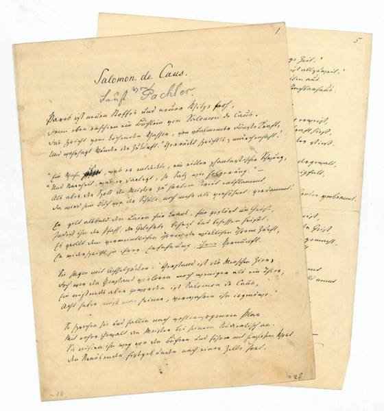5 SS. auf 3 Bll. 4to. 28 Strophen zu je vier Zeilen über den französischen Physiker und Ingenieur Salomon de Caus (1576-1626): "Paris ist neuen Stoffes und neuer Witze froh, | Denn eben erschien ein Büchlein von Salomon de Caus. | Das spricht vom kochenden Wasser, von qualmender Dünste Kraft, | Und wahrsagt Wunder der Zukunft. 'Verrückt spricht's; märchenhaft' [.]". - Das vorliegende Manuskript dürfte von Pachler einem Redakteur zugesandt worden sein, der Pachlers Unterschrift am Ende durchstrichen und in Bleistift mit eigener Hand unter den Titel gesetzt hat. - Der gebürtige Grazer und Freund von Franz Grillparzer, Anastasius Grün, Friedrich Halm und Paul Heyse war Leiter des "Illustrirten Familienbuchs des österreichischen Lloyd" und schrieb tls. unter dem Pseudonym C. Paul Gedichte, Romane und Schauspiele, die wiederholt aufgeführt wurden. Gemeinsam mit Ernst Birk, Eduard von Sacken und Joseph Müller gelang es ihm am 31. Oktober 1848 durch waghalsige Löscharbeiten die von den kaiserlichen Belagerungstruppen in Brand gesetzte Hofbibliothek vor dem Schlimmsten zu bewahren. - Vgl. Kosch III, 1971 und Czeike IV, 478.