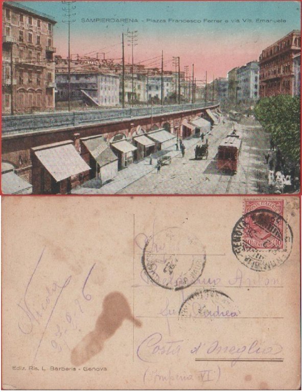 Sampierdarena (GE). Piazza F. Ferrer e via Vitt. Emanuele . Viaggiata 1926. Animata, tram