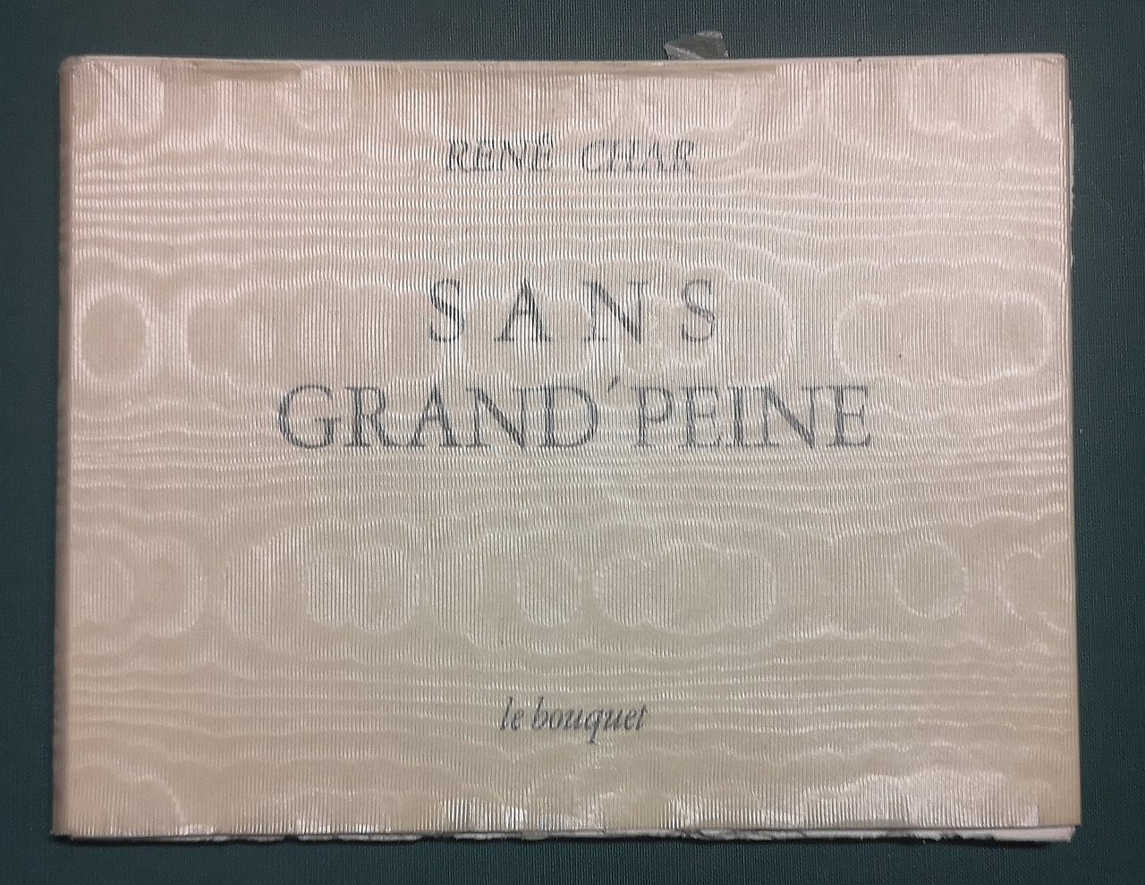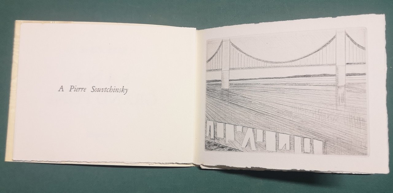>in-16 oblungo, pp. (28) a quaderni sciolti, con 1 tavola a punta secca e un acquerello originale di Pierre Charbonnier; brochure editoriale con sovracoperta in seta vegetale. Edizione originale, impressa in 49 esemplari su papier rives e 20 HC, fuori commercio, il presente è n. 1/20 HC, firmato al colophon da autore, incisore e tipografo (Char, Charbonnier e Puel). Perfetto esemplare di opera rara e ricercata.