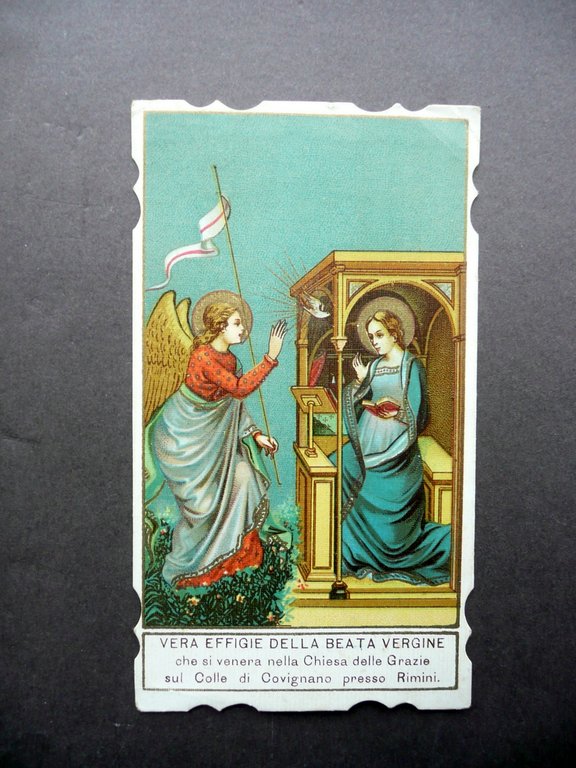 Santino, Vera Effigie della Beata Vergine che si venera nella Chiesa delle Grazie sul Colle di Covignano presso Rimini - Santino cromolitografico Senza dati tip., s. d. (primo '900 circa); santino cromolitografico a stampa; testo ad entrambi i lati. Margine sup. del retro con una vecchia anotazione a matita del precedente proprietario. Cm 11,5x6,5. Condizioni di conservazione Esemplare ben conservato con tracce d'uso; angoli sup. con poche minime tracce di piccole pieghette. SC03.D12082 N