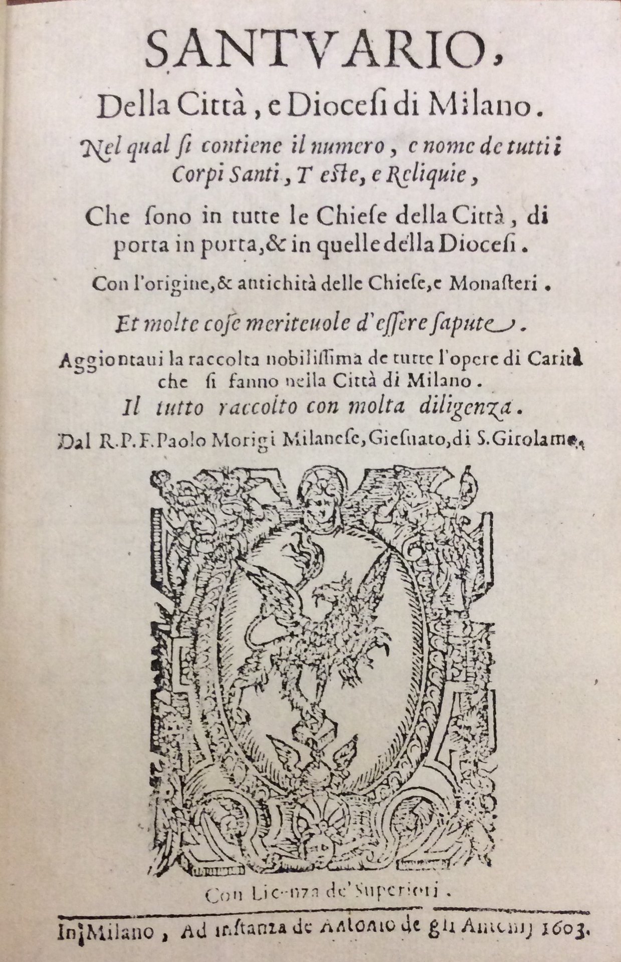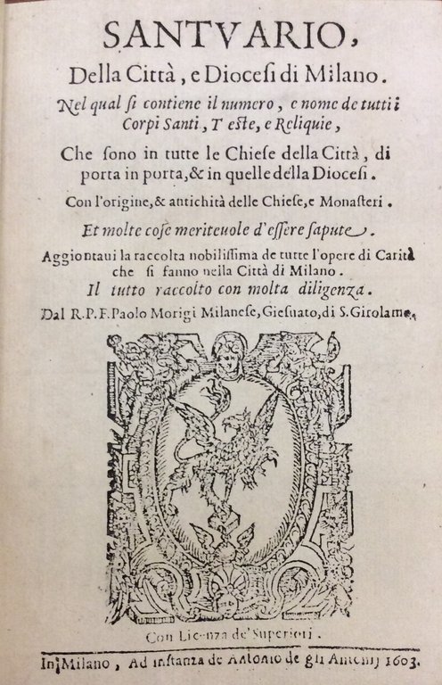 SANTUARIO DELLA CITTA' E DIOCESI DI MILANO NEL QUAL SI CONTIENE IL NUMERO E NOME DE TUTTI I CORPI SANTI TESTE E RELIQUIE. - E molte cose meritevoli d'essere sapute. Il tutto raccolto con molta diligenza dal R.P.F. Paolo Morigi Milanese, Giesuato, di S. Girolamo.