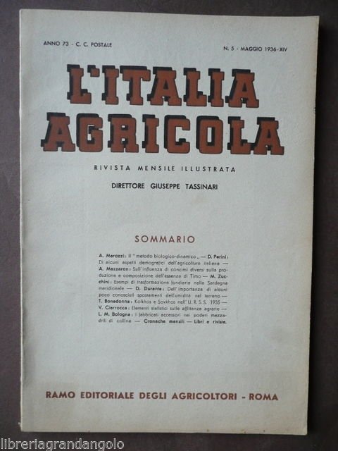 Vedere la descrizione dettagliata Zucchini M., Esempi di trasformazione fondiaria nella Sardegna Meridionale" pp. 10 con 7 ill. fotografiche di cui una a piena pagina in "L'Italia Agricola" Maggio 1936 Anno 73 numero 5 Numero Completo, cm. 18x26, pp. da 351 a 418 con ill., copertina ed. a col. Condizioni di conservazione Esemplare in buono stato, trascurabili tracce d'uso. Fotografie delle zone sottoposte alla trasformazione fondiaria. Interessante articolo di A. Marozzi "Il Metodo biologico-dinamico" sulle teorie di Rudolph Steiner "sull'essenza di timo". Per altri volumi e documenti su questo e altri argomenti visitate il nostro negozio "Libreria Grandangolo" CONDIZIONI DI VENDITA Spedizione Fino a 5 kg piego di libri raccomandato, oltre i 5 kg pacco postale. Si ricorda che l'imballo viene eseguito con la massima cura. La merce viene spedita a pagamento avvenuto e viaggia a rischio e pericolo dell'acquirente. Per maggiori informazioni vedi la pagina SPEDIZIONI del nostro negozio. Ritiro diretto Siamo disponibili per il ritiro diretto a Modena e a Milano. Per gli indirizzi delle sedi vedi la pagina DOVE SIAMO del nostro negozio. Acquisti multipli Se si acquistano più libri, la spedizione si paga una sola volta, purché si rispettino gli scaglioni di peso. Estero / Foreign For international shipment, please contact us. Metodo di pagamento Pay Pal, bonifico bancario, versamento postale (cc/p, vaglia o altro). La spedizione avverrà entro i primi 4 giorni lavorativi dopo la conferma di avvenuto pagamento. Si emette ricevuta fiscale e a richiesta fattura. Il pagamento deve essere effettuato entro 7 giorni lavorativi dalla data di acquisto, trascorsi i quali l'oggetto sarà rimesso in vendita. Feedback Viene rilasciato dall'acquirente dopo il ricevimento di quanto acquistato. Data la sua importanza, vi invitiamo a leggere il breve testo della pagina FEEDBACK del nostro negozio. Pertanto, in caso di qualsiasi problema, non esitate a contattarci. Diritto di recesso L'acquirente ha il diritto di restituire l'oggetto entro 14 giorni ed essere rimborsato, escluse le spese di porto e imballo. L'oggetto deve essere restituito, dopo previa comunicazione, imballato e nelle medesime condizioni di come era all'origine. Creato da Turbo Lister Strumento gratuito per mettere in vendita i tuoi oggetti. Metti in vendita i tuoi oggetti in modo facile e veloce e gestisci le inserzioni in corso. "