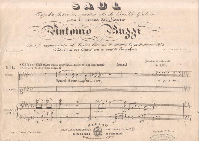 SAUL (1843). Tragedia Lirica in quattro Atti di Camillo Giuliani, come fu rappresentata al Teatro Carcano in Milano la Primavera del 1852. Riduzione per Canto con accompagnamento di Pianoforte. Scena ed Inno "Sui vanni infaticabili" eseguiti dal Sig.Rordas (Pl.n°18445).