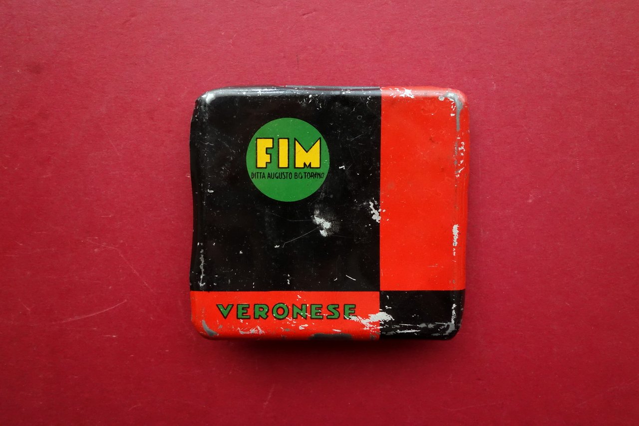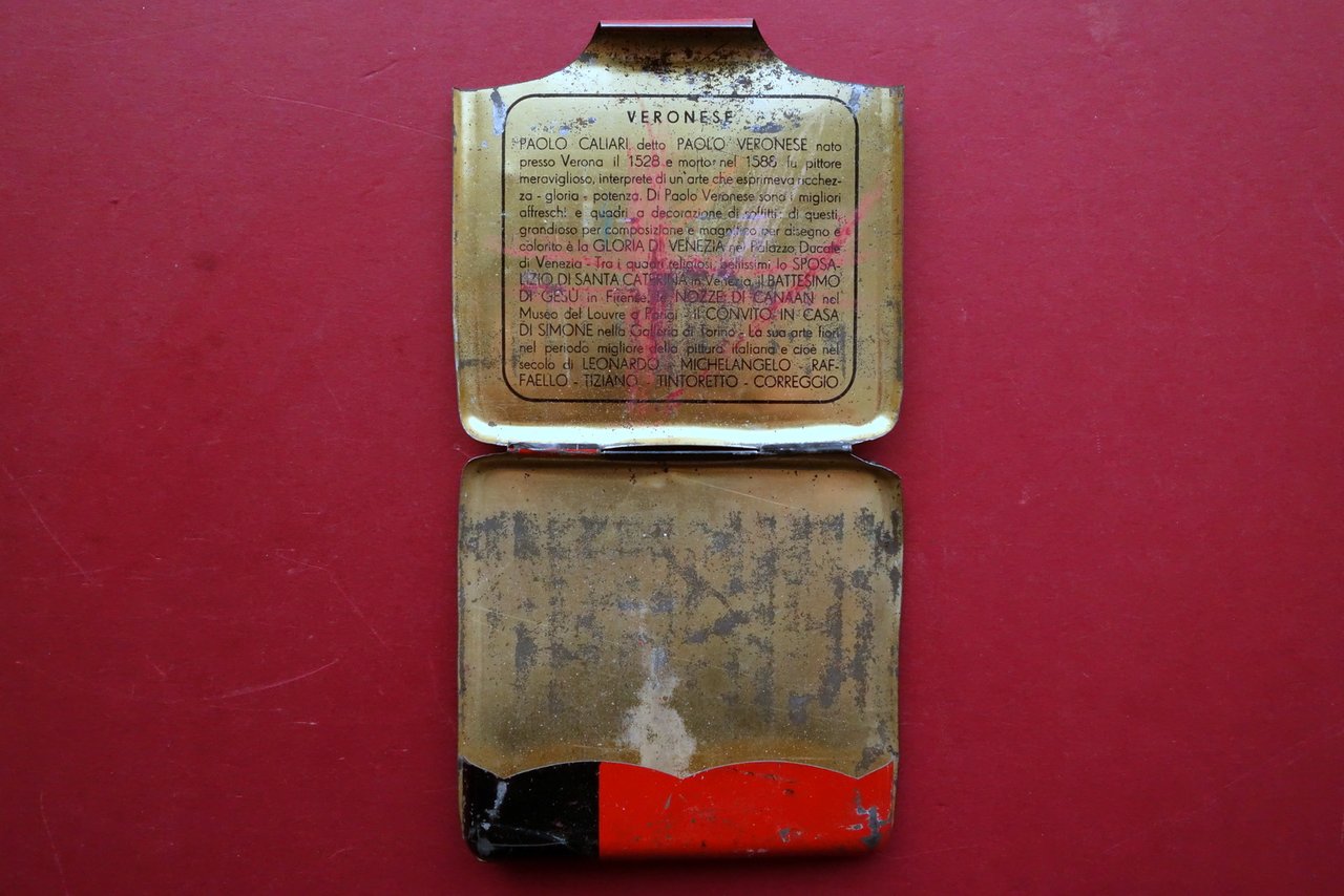 Scatola di latta per matite, FIM" - Ditta Augusto Bo - Torino Scatola di latta per matite a pastello Paolo Veronese con bella grafica a colori anni '50 circa Anni '50 circa; scatola di latta per matite a pastello, con bella grafica a colori a entrambi i lati. Vuota. Dimensioni: cm 9,5x10. Condizioni di conservazione Condizioni discrete con tracce d'uso; ammaccature e graffietti, alcune leggere abrasioni alla grafica a colori. Al lato interno qualche macchietta di colore rosso. Per ulteriori dettagli vedi foto. Condizioni come da foto e descrizione. SC04.D0543 N "