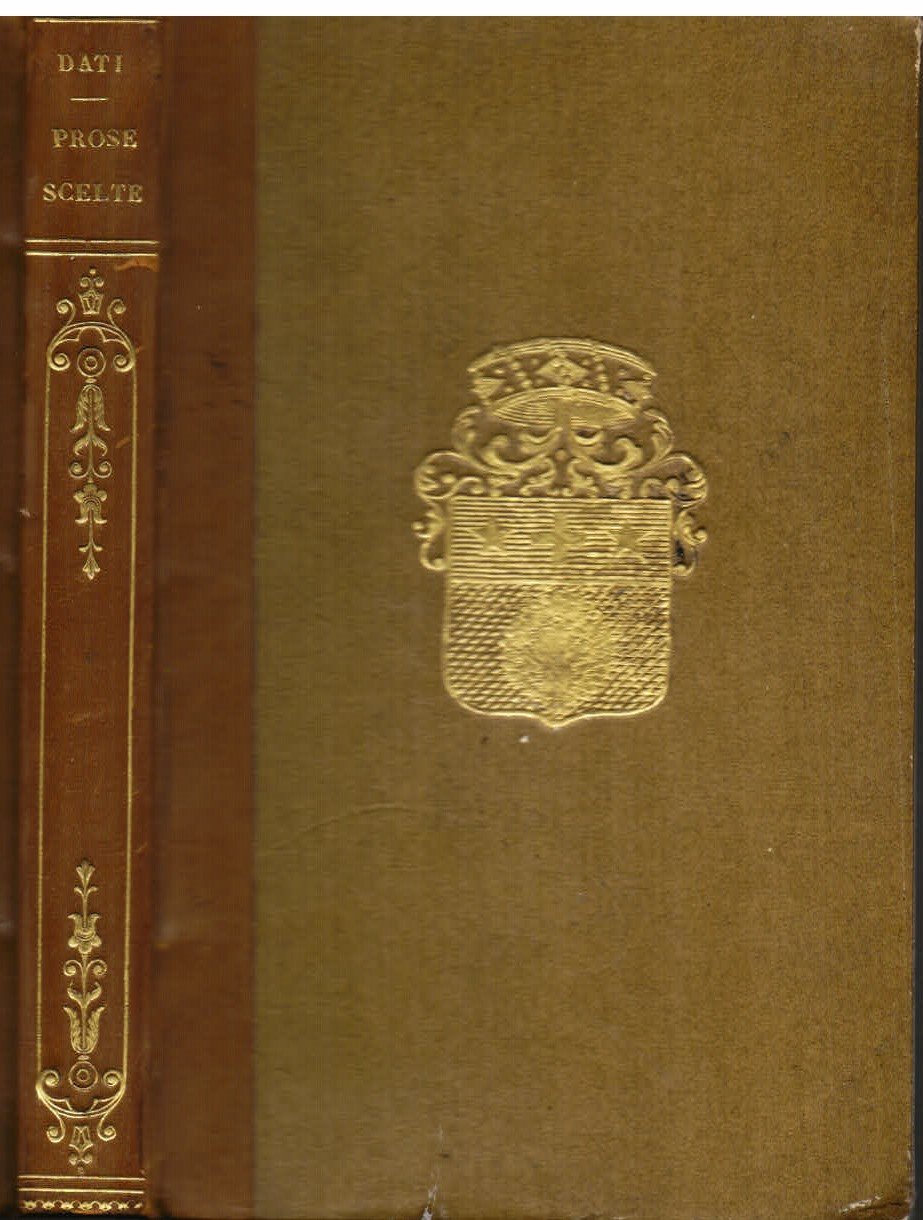 In-16°, pp. (2), 236, (4), legatura ottocentesca m. pelle marrone con titolo e fregi in oro al dorso e stemmi nobiliari impressi in oro ai piatti. Sguardie marmorizzate. Ritratto del Dati inciso dal Comirato all'antiporta. Ottimo stato. Raccolta curata dal Gamba di prose di vario genere del Dati, da quelle relative alla storia dell'arte antica alla sua difesa di Dante contro il giudizio di Monsignor Della Casa, dalle lettere e le orazioni sino agli scritti di argomento curioso ('Sul costume di bandire le cose perdute affine di ritrovarle', 'Sull'antichità dell'uso di portare gli orecchini', ecc.). Gamba, 1906.