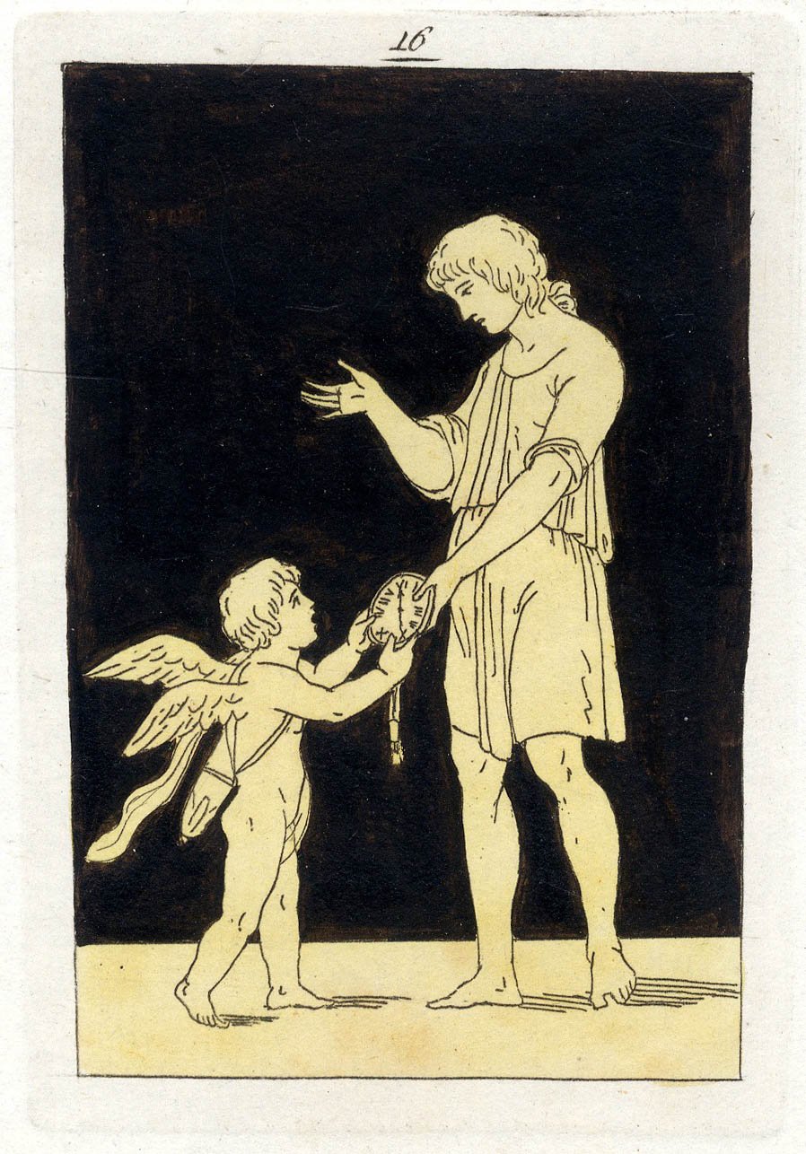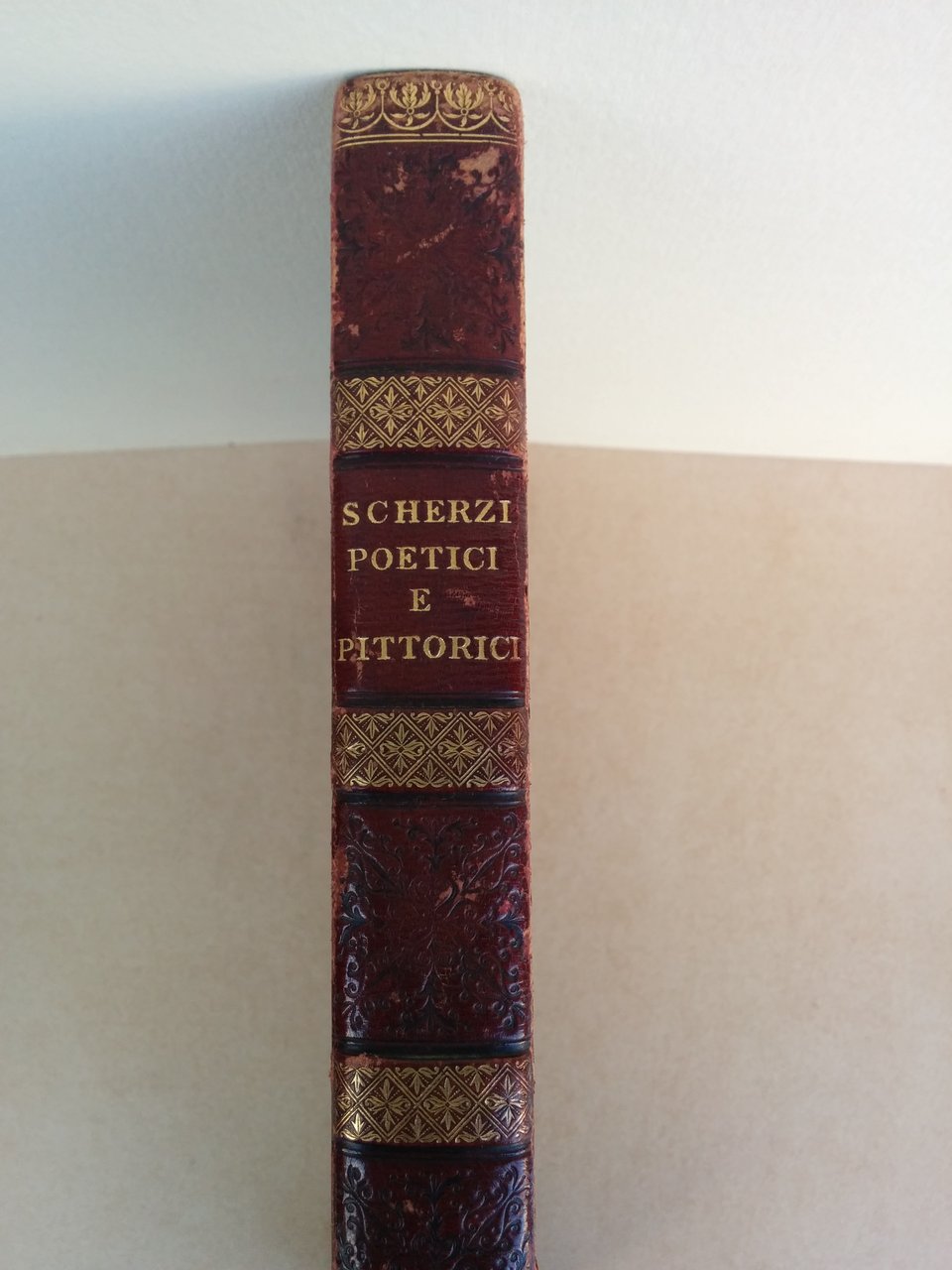 >in-4 real folio, in totale ff. 93: 4 fogli preliminari (titolo, 2 di dedicatoria, occhietto), 47 di testo, indice, 41 tavole compreso titolo. Legatura d'amatore in marocchino granata a grana lunga, cornice di palmette impresse a secco piatti, motivi fogliacei angolari in oro, dorso a nervi con ricchi fregi a secco e in oro. Dedica a stampa ad Alessandro de Souza e Holstein, firmata dal De Rossi, autore dei versi redatti in vario metro e con tema allegorico amoroso. Ogni scherzo poetico, stampato in tondo, è numerato in romano entro una tavoletta, e a fronte reca un illustrazione. Esemplare sconosciuto alle bibliografie in quanto in formato in-4 grande e con rami all'etrusca (in giallo e nero) incisi da Texeira Barreto e non da Rosaspina. Questa edizione, una delle più eleganti e raffinate produzioni di Bodoni, è illustrata da antiporta con data Roma 1794 e 40 belle tavole incise da Texeira numerate nel margine superiore. Bodoni stampò diverse versioni di questo libro, variando la composizione, il formato, e la coloritura dei rami. Si conoscono esemplari con le tavole in nero, in nero e giallo all'etrusca del Rosaspina, oppure, in pochissimi casi, contornate dalle bordure neoclassiche incise da Giacomo Mercoli. ''Si trovano degli esemplari coi 41 rami neri; altri coi medesimi coloriti all'etrusca; altri coi rami stampati in rosso pallido entro un arabesco nero. E finalmente furono tirati per dodici copie, tanto il rame, quanto l'arabesco, con inchiostro chiarissimo, per chi avesse talento di farli acquerellare in colore. Presso di lui ne esistono delle prove; ma non fu contento del lavoro'' (DE LAMA). Gherardo De Rossi (Roma, 1754 — 1827), direttore dell'Accademia reale di Napoli. Figlio di un banchiere, fu ministro delle finanze della repubblica romana dal 1798 al 1800. Autore di 16 commedie e di saggi critici sul teatro, fece parte dell'Arcadia, con il nome di Perinto Sceo e fu presidente dell'Accademia di belle arti del Portogallo. Per questa ragione scelse ad illustrare gli Scherzi l'artista portoghese José Teixeira Barreto (o Tekeira, 1763-1810, cfr. Pedro VITORINO, J.Teixeira B., Artista Portuense, Coimbra, 1925). Alessandro de Souza e Holstein, Conte di Sanfrè e di Motta Isnardi, (Lisbona 1751 - Roma 1803) fu ambasciatore di Portogallo a Roma, ed ebbe incarichi presso il governo sabaudo. Buon esemplare, al contro piatto anteriore ex libris Waletr John Heathcote, Kilmenston Manor. Brooks 599 ma con varianti