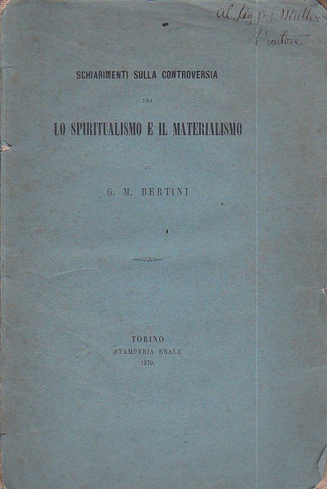 In-8°, pp. 71, brossura editoriale con invio autografo del Bertini 'al sig. prof. Müller', probabilmente il grande linguista Max Müller. Restauri al dorso. Bell'esemplare. Prima e unica edizione in volume a sé, rara, di questa memoria filosofica di uno dei principali pensatori di orientamento cattolico dell'800 italiano, le cui opere (oggetto in seguito anche del vivace interesse di Gentile e di Gobetti, che a lungo ne discorre nel 'Risorgimento senza eroi') incessantemente insistettero sulla necessità di armonizzare la fede con la ragione. ' Il 9 gennaio 1870 leggeva all'Accademia delle Scienze di Torino gli Schiarimenti sulla controversia tra lo spiritualismo e il materialismo (vedi in Scritti filosofici, a cura di M. F. Sciacca, Milano 1942, pp. 185-193): l'atteggiamento del Bertini, nei confronti del materialismo si rivela decisamente critico.' (Virginia Cappelletti in D.B.I., IX, 1967). Estratto dagli 'Atti della R. Accademia delle Scienze di Torino', vol. V, adunanza del 9 gennaio 1870.