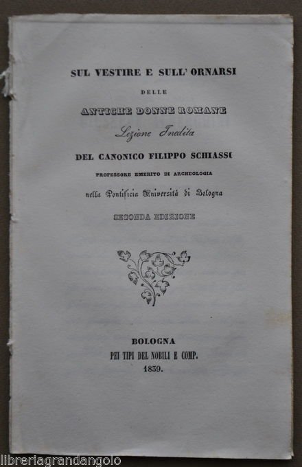 Vedere la descrizione dettagliata Schiassi can. Filippo, Sul Vestire e sull'Ornarsi delle Antiche Donne Romane" Lezione Inedita del canonico Filippo Schiassi Professore emerito di Archeologia nella Pontificia Università di Bologna Seconda edizione Pei Tipi del Nobili e Comp., Bologna 1839; 20x12,5 cm; pp. 21. Condizioni di conservazione. Opuscolo in buono stato con leggere tracce d'uso. Senza brossura editoriale in quanto proveniente da raccolta ottocentesca di opuscoli insieme rilegati. Slegato e con lacerazioni alle pieghe dei fogli. Interni perfetti con minime bruniture. Bel lavoro sul vestire delle donne romane con informazioni desunte dalle Fonti antiche. Dedica del marchese Rusconi al Legato cardinale Alberghini. Per libri e documenti su questo e altri argomenti visitate il nostro negozio "Libreria Grandangolo" CONDIZIONI DI VENDITA Spedizione Fino a 5 kg piego di libri raccomandato, oltre i 5 kg pacco postale. Si ricorda che l'imballo viene eseguito con la massima cura. La merce viene spedita a pagamento avvenuto e viaggia a rischio e pericolo dell'acquirente. Per maggiori informazioni vedi la pagina SPEDIZIONI del nostro negozio. Ritiro diretto Siamo disponibili per il ritiro diretto a Modena e a Milano. Per gli indirizzi delle sedi vedi la pagina DOVE SIAMO del nostro negozio. Acquisti multipli Se si acquistano più libri, la spedizione si paga una sola volta, purché si rispettino gli scaglioni di peso. Estero / Foreign For international shipment, please contact us. Metodo di pagamento Pay Pal, bonifico bancario, versamento postale (cc/p, vaglia o altro). La spedizione avverrà entro i primi 4 giorni lavorativi dopo la conferma di avvenuto pagamento. Si emette ricevuta fiscale e a richiesta fattura. Il pagamento deve essere effettuato entro 7 giorni lavorativi dalla data di acquisto, trascorsi i quali l'oggetto sarà rimesso in vendita. Feedback Viene rilasciato dall'acquirente dopo il ricevimento di quanto acquistato. Data la sua importanza, vi invitiamo a leggere il breve testo della pagina FEEDBACK del nostro negozio. Pertanto, in caso di qualsiasi problema, non esitate a contattarci. Diritto di recesso L'acquirente ha il diritto di restituire l'oggetto entro 14 giorni ed essere rimborsato, escluse le spese di porto e imballo. L'oggetto deve essere restituito, dopo previa comunicazione, imballato e nelle medesime condizioni di come era all'origine. Creato da Turbo Lister Strumento gratuito per mettere in vendita i tuoi oggetti. Metti in vendita i tuoi oggetti in modo facile e veloce e gestisci le inserzioni in corso. "