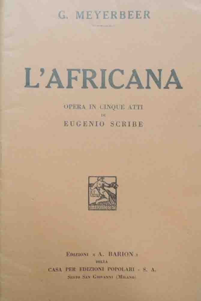 L’africana. Opera in cinque atti di Eugenio Scribe, traduzione italiana di M. Marcello, musica di Giacomo Meyerbeer, Edizioni A. Barion della Casa per Edizioni Popolari S. A., Sesto San Giovanni (Milano) 1934, pp. 32, cm 18, opuscolo spillato. Firma d’appartenenza al margine del frontespizio. Lievi tracce d’uso, traccia di gora per nulla deturpante al margine esterno della copertina posteriore, leggera brunitura della carta, per il resto copia ben conservata.