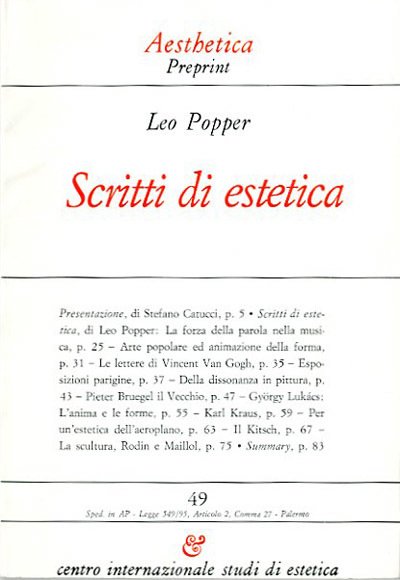 83 p. ; 21 x 15 cm. Aesthetica. Preprint, 49. Il volume è stato tradotto e curato da Stefano Catucci e rappresenta la prima raccolta italiana dei saggi più significativi di Leo Popper. Leo Popper (1886-1911) è stato un saggista cresciuto a Budapest come György Lukács, un suo caro amico, ed è morto di tubercolosi prima di raggiungere i 25 anni. Dopo aver ricevuto una solida educazione musicale nella sua prima giovinezza, si è dedicato principalmente alla pittura ed è solo in relazione a questa attività che ha coltivato la teoria estetica e la critica d'arte. Questa gerarchia di interessi emerge molto chiaramente dai suoi saggi, solo alcuni dei quali sono stati pubblicati durante la sua vita. Leo Popper si avvicina all'arte da un punto di vista immanente. Egli attribuisce grande importanza alla tecnica, ai materiali e agli aspetti pratici del lavoro dell'artista. Tale approccio gli consente di rielaborare in modo originale molte delle questioni che erano al centro dei dibattiti sull'estetica del ventesimo secolo: dall'ornamento (Riegl) alla bellezza funzionale (Loos), dalla differenza tra astrazione ed empatia (Worringer ) a quello tra talento e genio (Weininger). In tutti questi casi, Popper si distacca radicalmente dallo psicologismo, così come dai più estremi tipi di funzionalismo, e nella sua estetica adotta "forma" come concetto chiave. Un altro aspetto importante del pensiero di Popper, come emerge dai suoi saggi su "Kitsch" (1910), è la fondamentale dimensione "etica" che è alla base dell'intera struttura formale dell'opera d'arte. "Kitsch" è un simbolo dell'inversione etica della modernità, perché è allo stesso tempo una sfida alle leggi del peso e un tipo di individualismo legato al fallimento. Allo stesso tempo, tuttavia, un nuovo mezzo di trasporto come l'aereo (cfr. "Towards a Aesthetic of Airplanes", 1910) mostra come la tecnologia debba ancora aggiustare il suo rapporto con l'estetica. Tutti i saggi di Leo Popper sono informati anche da un altro concetto che non ha mai discusso in grande dettaglio, sebbene rappresenti senza dubbio il suo contributo più originale e duraturo all'estetica: la nozione di incomprensione. Secondo Hans Robert Jauss, l'approccio di Leo Popper alla nozione di "incomprensione" prefigura l'estetica moderna dell'accoglienza. Ed è per ragioni simili che György Lukács, le cui prime opere furono fortemente influenzate da Popper, poteva descriverlo come «un caso unico nella storia della critica d'arte». Brossura editoriale, coperta in cartoncino flessibile plastificato lucido. Titolo impresso in rosso al piatto e al dorso. Codice libreria 4659.