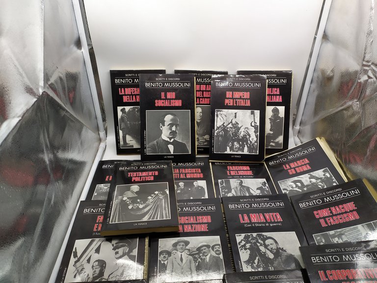 18 volumi ,con la prefazione di vittorio mussolini ,in cui vengono raccolti gli scritti e i discorsi del duce ,benito mussolini,senza commento e raggruppati per argomento ,tratti dall'opera omnia.Ogni volume ha allegato la riproduzione di un quotidiano delll'epoca