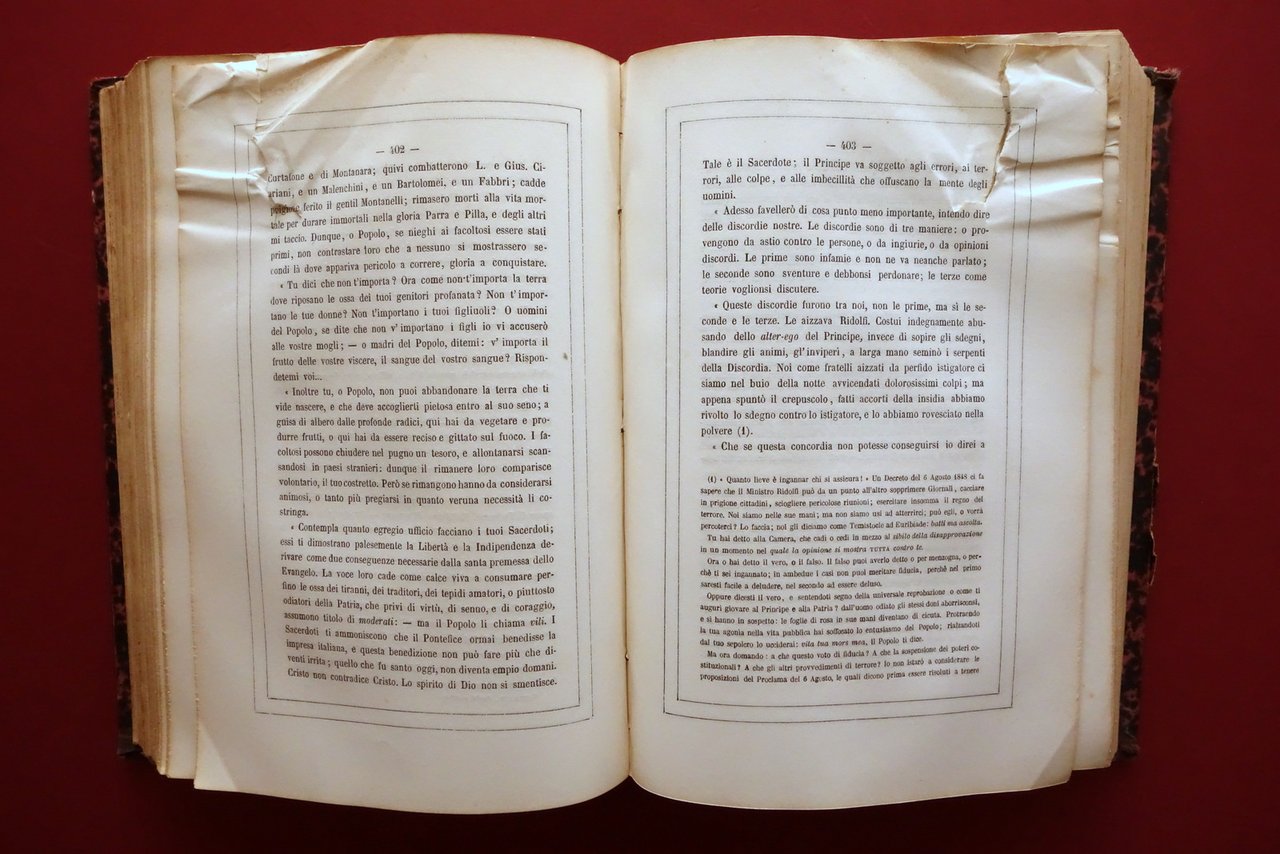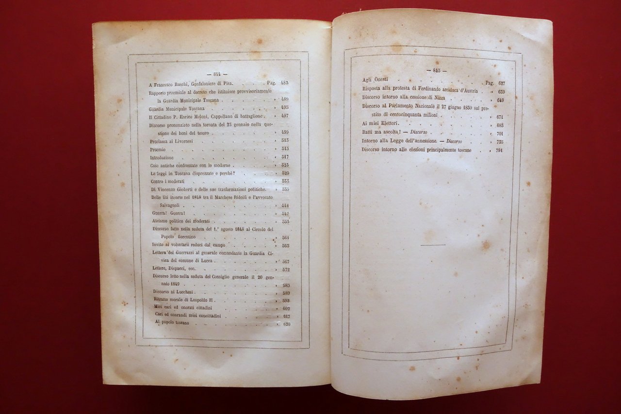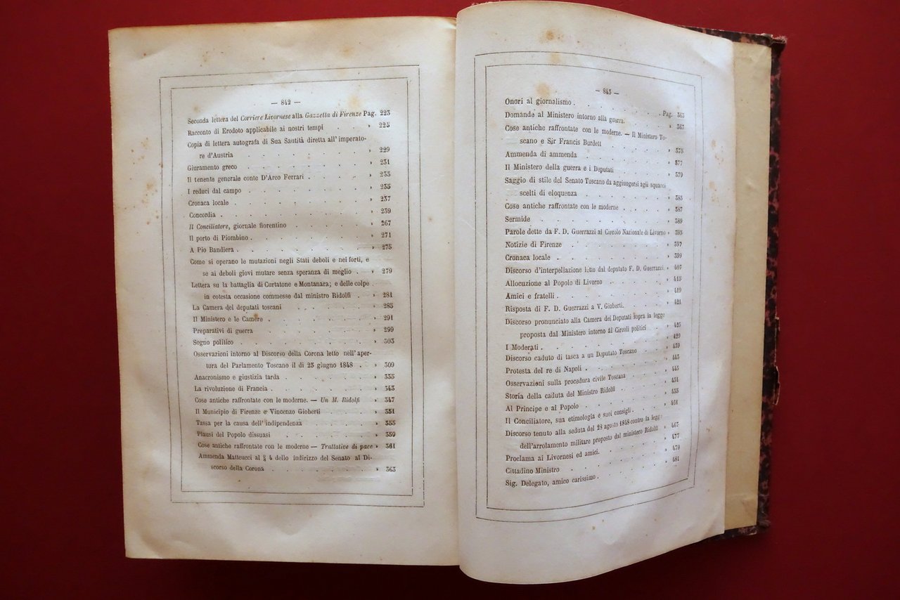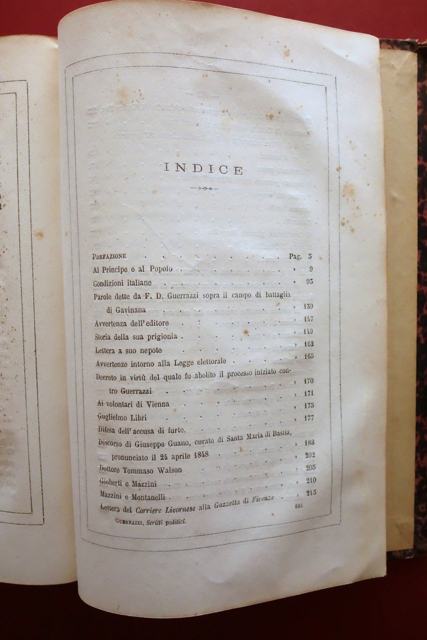 F. D. Guerrazzi, Scritti Politici di F. D. Guerrazzi - volume unico M. Guigoni, Torino - Milano 1862; cm 25,5x17; pp. 846 con una tavola inc. in b/n fuori t.; legatura d'epoca in mezza tela con titolo impresso in oro al dorso, piatti marmorizzati. Condizioni di conservazione Buone condizioni con tracce d'uso, coperta con alcuni minimi strappetti e abrasioni ai margini e agli angoli dei piatti, cuffia inf. con alcune piccole lievi abrasioni. Interni buoni con lieve foxing; margine superiore delle pp. 397-420 con leggere ammaccature e uno strappetto di circa 5-6 cm che non compromette la lettura del testo (vedi foto). SETT168.L26328 N