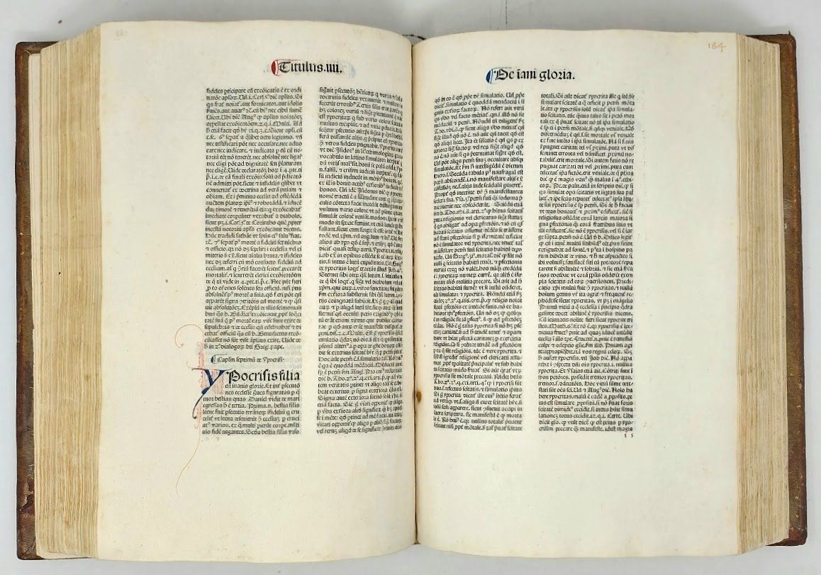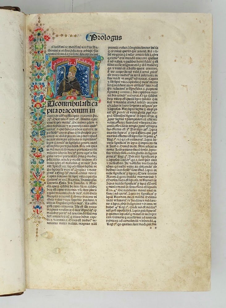 >in-folio (310x205 mm), ff. (366, il primo bianco presente), importante, splendida leg. del tempo uso monastico con i piatti in assicelle ricoperti di pelle decorati a secco da vari ordini di bordure, dorso a 4 nervi, con losanghe intrecciate e piccole decorazioni a fiori; 4 borchie metalliche conservate al piatto anteriore. (piccoli restauri). F. 2r., titolo: ''Clarissimi ac doctissimi viri fratris Anthonini...secunda pars summe...''; f. 364r., colophon: ''Impressum est opus...Venetijs impensis Johannis de Colonia sociique eius Johannis Manthen de Gherretzem. M.cccc.lxxvij''; f. 366r.: ''Registrum 2e partis...''. Testo in car. semigotico, su due colonne, interamente rubricato, con gran numero d'iniziali su cinque righe, dipinte in rosso o blu con fregi filigranati nel colore inverso; una grande iniziale, abilmente ritoccata nel XIX secolo, su tredici righe, in oro con miniatura in verde e rosa; all'interno ritratto a mezzo busto del Santo, che sfoglia il libro; estensione lungo tutto il margine interno, con decorazione floreale in vari colori, e pointillé dorato. L'unica parte pubblicata dagli stampatori Joh. de Colonia e Joh. Manthen e seconda ediz. in assoluto di questa parte della ''Summa theologica'' (che si compone di 4 parti ed apparve completa per la prima volta a Norimberga, A. Koberger, 1477-79). La ''Summa'' è l'opera capitale di S. Antonino (Firenze 1389 - 1459, frate domenicano, arcivescovo di Firenze dal 1445, dai suoi concittadini inviato in varie missioni diplomatiche presso vari Pontefici) con cui esercitò un grande influsso fino al 1600; ebbe 20 edizioni complete dal 1477 (Norimberga e Venezia) al 1740 e moltissime altre incomplete. ''Importante sotto l'aspetto teologico-morale ed etico-economico, persegue un fine più pratico che teorico...'' (M. Grabmann, Storai teol. catt., Milano, 1939, p. 138). Esemplare stupendo, impresso con somma cura su carta forte, a grandi margini, in straordinaria legatura dell'epoca (lieve alone al f.2, con piccolo antico restauro al verso). Al contropiatto timbro di biblioteca privata. BMC V, 228. Goff A-868. IGI 700. HC 1255. GW 2196. Pell 888. Oates 1725. Pr 4323. Non in Polain.
