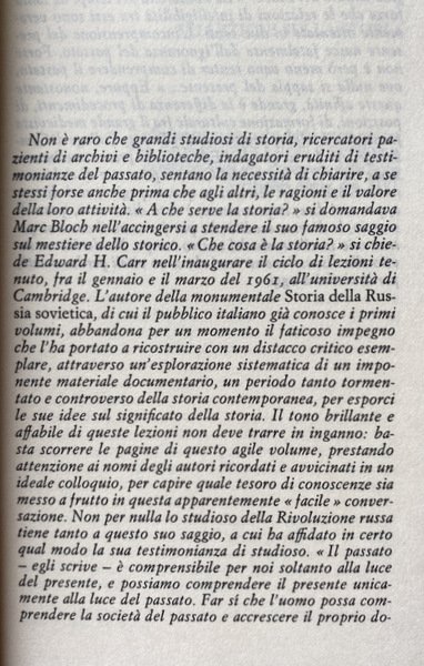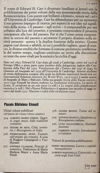 Il nome di Edward H. Carr è diventato familiare ai lettori con la pubblicazione della sua monumentale storia della Russia sovietica. Con queste sue brillanti «lezioni», tenute nel 1961 all'Università di Cambridge, Carr ci espone le sue idee sul significato della storia. «II passato - egli scrive - è comprensibile per noi soltanto alla luce del presente, e possiamo comprendere il presente unicamente alla luce del passato. Far sì che l'uomo possa comprendere la società del passato e accrescere il proprio dominio sulla società presente: questa è la duplice funzione della storia». Queste pagine, rigorose nel metodo e al tempo stesso invitanti alla lettura per il piglio saggistico con cui sono scritte, vogliono costituire un invito alla discussione su temi vitali per la società d'oggi.