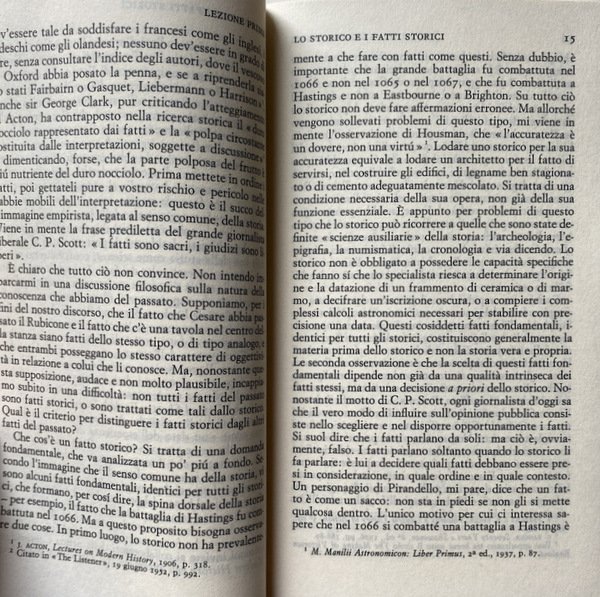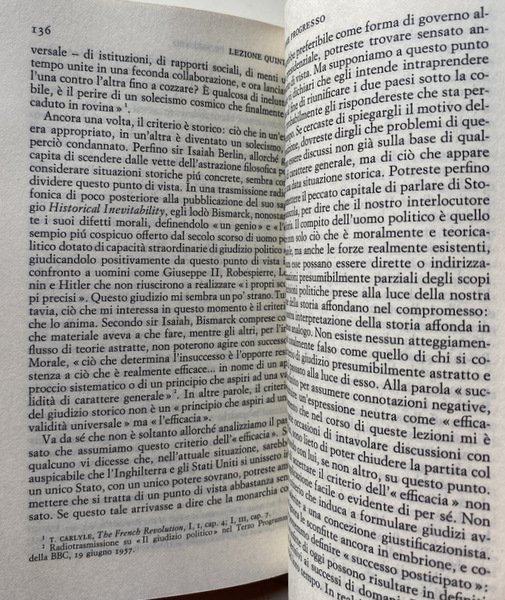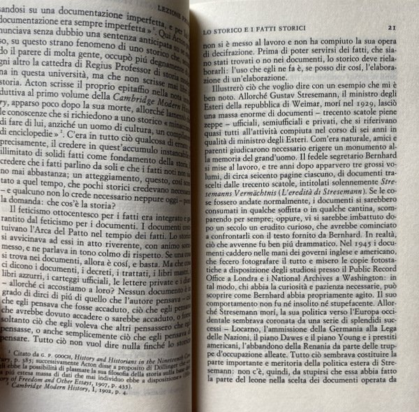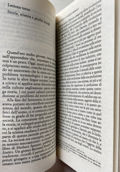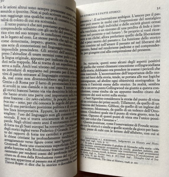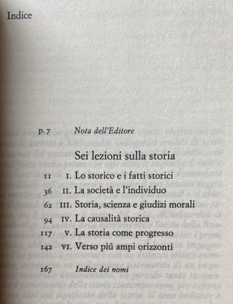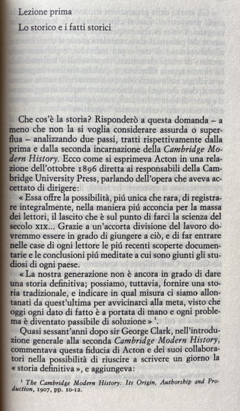 Soggetti: Storia, Storiografia, Lezioni universitarie, Corsi, Classici, Filosofia della storia, Teorie, Ideologie politiche, Concezioni, Eventi storici, Marxismo, Fonti, Analisi storica, Riferimento, Bibliografia, Fatti storici, Progresso storico, Evoluzione, Umanità, Crisi, Decadenza, Fine, Politica estera, Diplomazia, Stati, Relazioni internazionali, Guerre, Potere, Imperialismo, Economia, Società, Ricerca storica, Saggi, Insegnamento, Metodologia, Didattica, Studi storici, Critica del testo, Testi universitarie, Seminari, Cronologia, Tecnica, Metodo, Esperienza, Falsità, Notizie false, Propaganda, Testimoni, Testimonianze, Oggettività, Interpretazione, Polemiche, Paradigmi, Lettura, Letture, Critici, Revisionismo, Futuro, Passato, Presente, Mentalità, Giudizio storico, Consultazione, Scienze sociali, Teoria, "Che cos'è la storia?", Documenti, Iscrizioni, Reperti, Dialettica, Culto, Individualismo, Miti storici moderni, Rinascimento, Medioevo, Antichità, Cattivo re Giovanni, John Lackland, Carattere, Comportamento, Individui, Causalità, Eterogenesi dei fini, Avvenimenti, Mommsen, Impero romano, Tucidide, Erodoto, Falsi storici, Biografi, Biografie, Memorie, Punti di vista, Difesa, Manipolazione, Pseudoproblemi, Determinismo, Hegel, Caso, Naso di Cleopatra, Concezione deterministica, Fatti accidentali, Napoleone, Anni Sessanta, Libri Vintage Fuori catalogo, Libri usati come nuovi, Scienza, Stampa, Editoria, Media, Previsioni, Profezie, Conoscenza, Coscienza, Marx, Liberalismo, Comprensione, Henri Poincare, Bertrand Russell, Rivoluzione bolscevica, Rivoluzione francese, Comunismo, Democrazia, Sir Isaiah Berlin, Cambridge, Oxford, Storiografia britannica, Stresemann, W. A. Dwiggins, A. J. P. Taylor, Leggi, Ipotesi, Popper, Meinecke, Freud, Butterfield, George Macaulay Trevelyan Lectures, Marc Bloch, Apologia, R.W. Davies, Dominio, Funzione, Archivio, Beatniks, Ottocento, Novecento, Ranke, Etica, Morale, Locke, Kant, George Clark, Pirandello, Tolstoj, Toynbee, Hitler, Lenin, Acton, Bury, Burckhardt, Historiography, University lectures, Courses, Classics, Philosophy of history, Theories, Political ideologies, Conceptions, Historical events, Sources, Analysis, Reference, Bibliography, Facts, Progress, Evolution, Humanity, Crisis, Decadence, End, Foreign policy Diplomacy, States, International relations, Wars, Power, Imperialism, Economy, Society, Historical research, Essays, Teaching, Methodology, Didactics, Historical studies, Text criticism, University texts, Seminars, Chronology, Technique, Method, Experience, Falsehood, Fake news, Witnesses, Testimonials, Objectivity, Interpretation, Controversies, Paradigms, Reading, Readings, Critics, Revisionism, Future, Past, Present, Mindset, Judgment, Consultation, Social sciences, Theory, "What is history? ", Documents, Inscriptions, Finds, Dialectics, Cult, Individualism, Modern historical myths, Renaissance, Middle Ages, Antiquity, Bad king John, Character, Behavior, Individuals, Causality, Heterogenesis of ends, Events, Roman empire, Thucydides, Herodotus, False historians, Biographers, Biographies, Memories, Points of view, Defense, Manipulation, Pseudo-problems, Determinism, Case, Nose, Deterministic conception, Accidental facts, Napoleon, Sixties, Out of print books, Used books as new, Science, Press, Publishing, Forecasts, Prophecies, Knowledge, Consciousness, Liberalism, Understanding, Bolshevik Revolution, French Revolution, Communism, Democracy, British Historiography, Laws, Hypothesis, Apology, Domain, Function, Archive, Nineteenth, Twentieth Century, Ethics