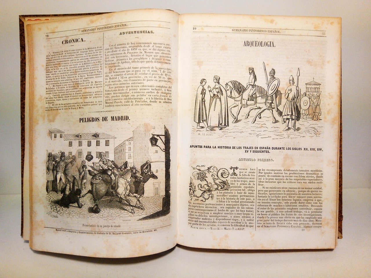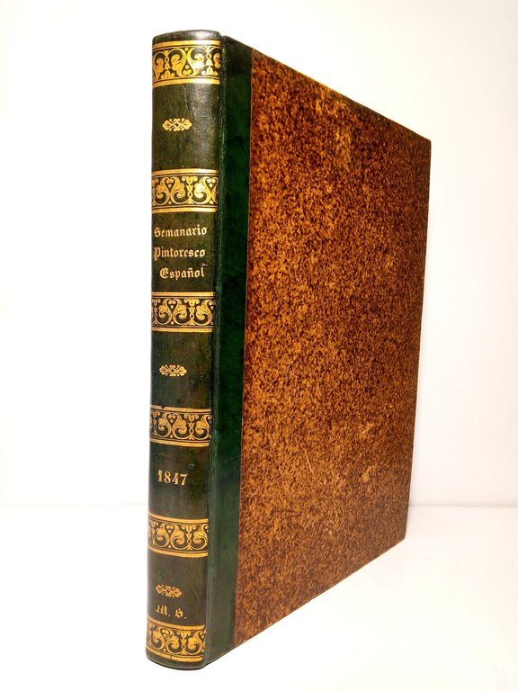 Madrid: Semanario Pintoresco Español - Imp. y Establecimiento de Grabado de Don Baltasar González, Editor, 1847.- 470 p.: Profusión de finos grabados xilográficos intercalados entre el texto; 4º mayor (27,3 x 19,5 cm); Media piel época, lomo dorado.- Colaboran entre otros muchos: Sras. C. Coronado y G. Gómez de Avellaneda, Sr. Amador de los Ríos, Bretón de los Herreros, Campoamor, Hartzenbusch, Madrazo, Príncipe, Pi y Margall, Ponzano, Rodríguez Ribí, Romero Larrañaga, Villoslada, Zorrilla, etc. Interior con motas de óxido. Encuadernación en excelente estado. LITERATURA Y FILOSOFÍA ESPAÑOLAS DE LOS SIGLOS XIX-XXI Y SU HISTORIA EN GENERAL