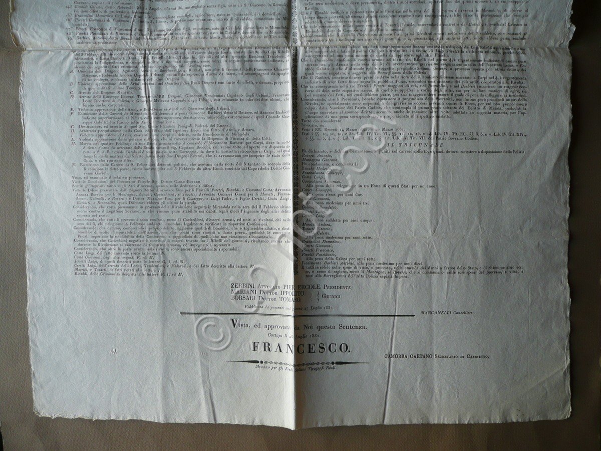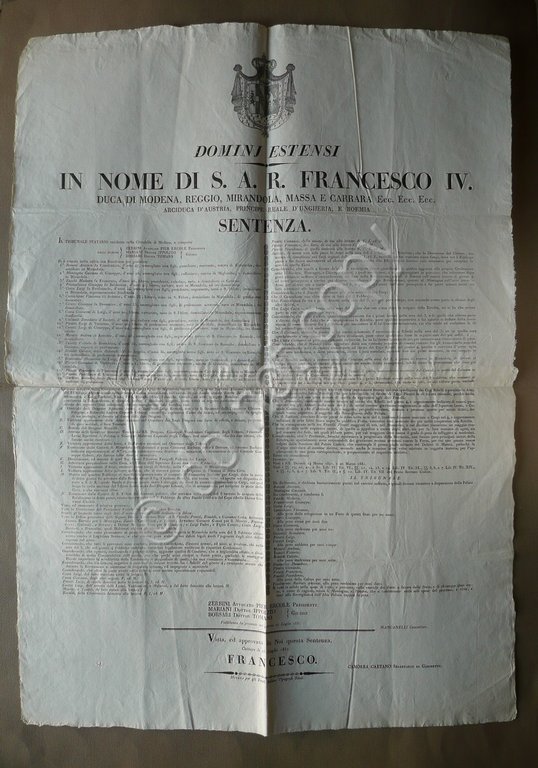 Sentenza, Dominj Estensi In nome di S. A. R. Francesco IV Duca di Modena, Reggio, Mirandola, Massa e Carrara, Ecc. ecc. ecc. [.] Il tribunale Statario residente nella Cittadella di Modena, e composto da [.] Si è riunito nella solita sua Residenza per giudicare [.] Ritenuti complici della Rivoluzione avvenuta nella Città di Mirandola contro il Legittimo Sovrano Estense nella sera del 3 febbrajo ultimo scorso circa le sette e mezza pomeridiane, coll'essersi da più bande armate dirette dai Capi Ribelli [.] Ed altri spiegata la Bandiera Tricolore, e proclamata la Indipendenza [.]" Per gli Eredi Soliani Tipografi Reali, Modena 1831, margini alla forma, testo due colonne, bello stemma Estense inciso. A causa delle grandi dimensioni la sentenza è composta da due fogli applicati al retro. Cm 86x61,5. Condizioni di conservazione Esemplare ben conservato con leggere tracce d'uso, normali pieghe di conservazione. Interessantissima sentenza emessa nei confronti dei partecipanti ai Moti avvenuti a Mirandola nel 1831, sull'onda di quelli di Modena. Sono presenti le descrizioni dei fatti, i nomi degli imputati, il processo e le condanne. Tra gli imputati vi sono Francalanza, Cavicchioni, Ceretti Giuseppe (scrittore), Costa, Golinelli, Ceretti Luigi, Pivetti, Moretti, Tosatti, Barbieri, ecc. Esemplare pressoché in ottimo stato di conservazione. SC03.D9566 N F "