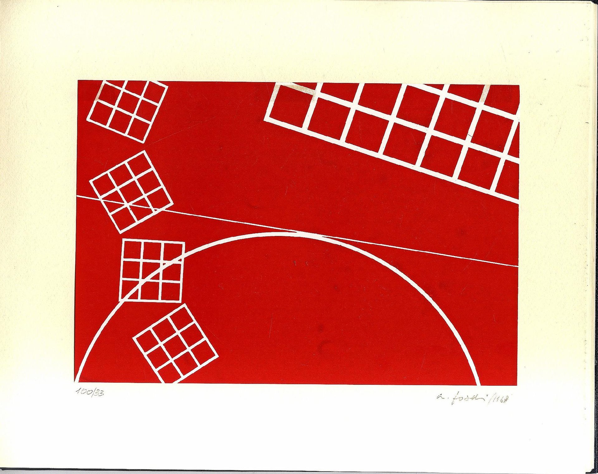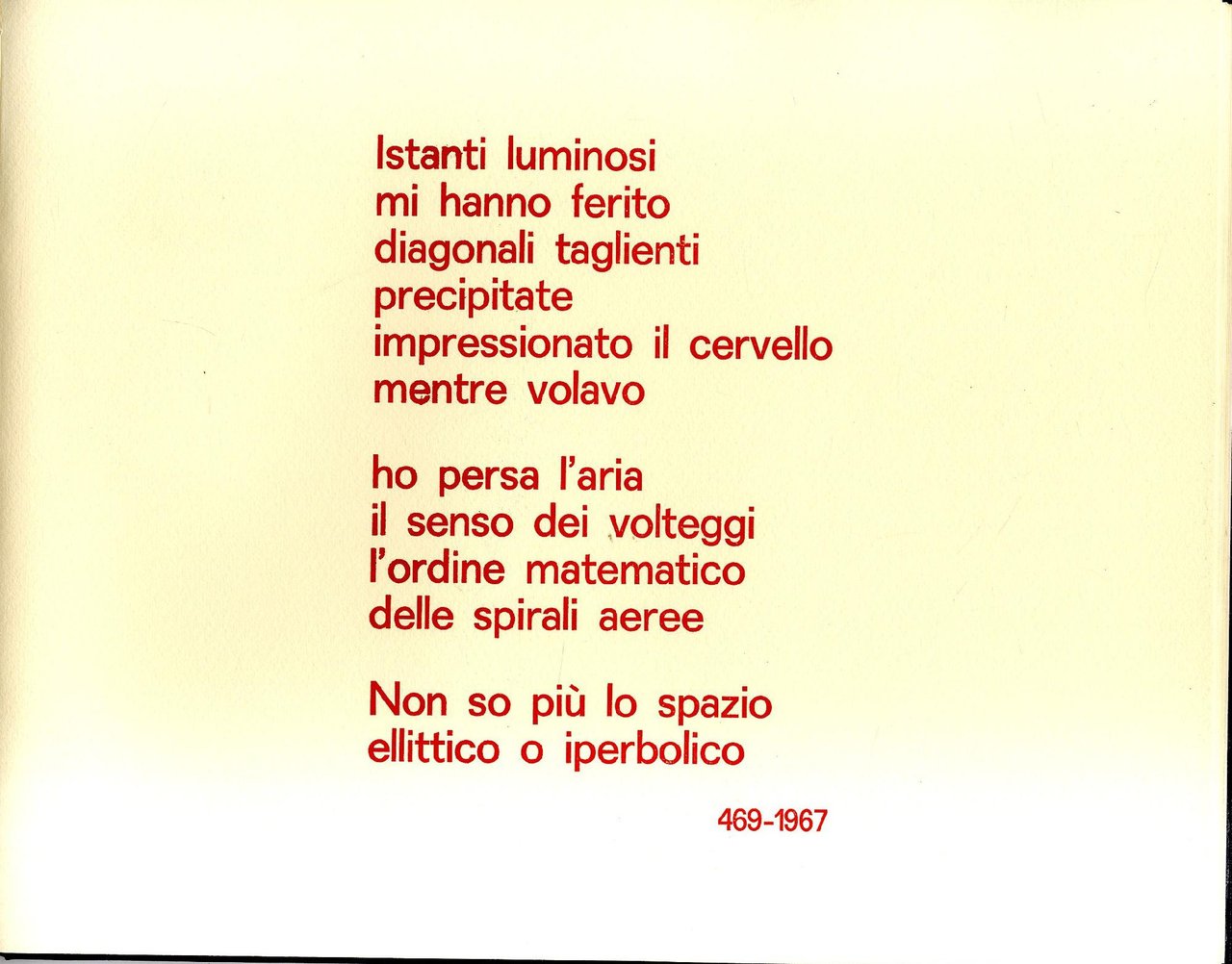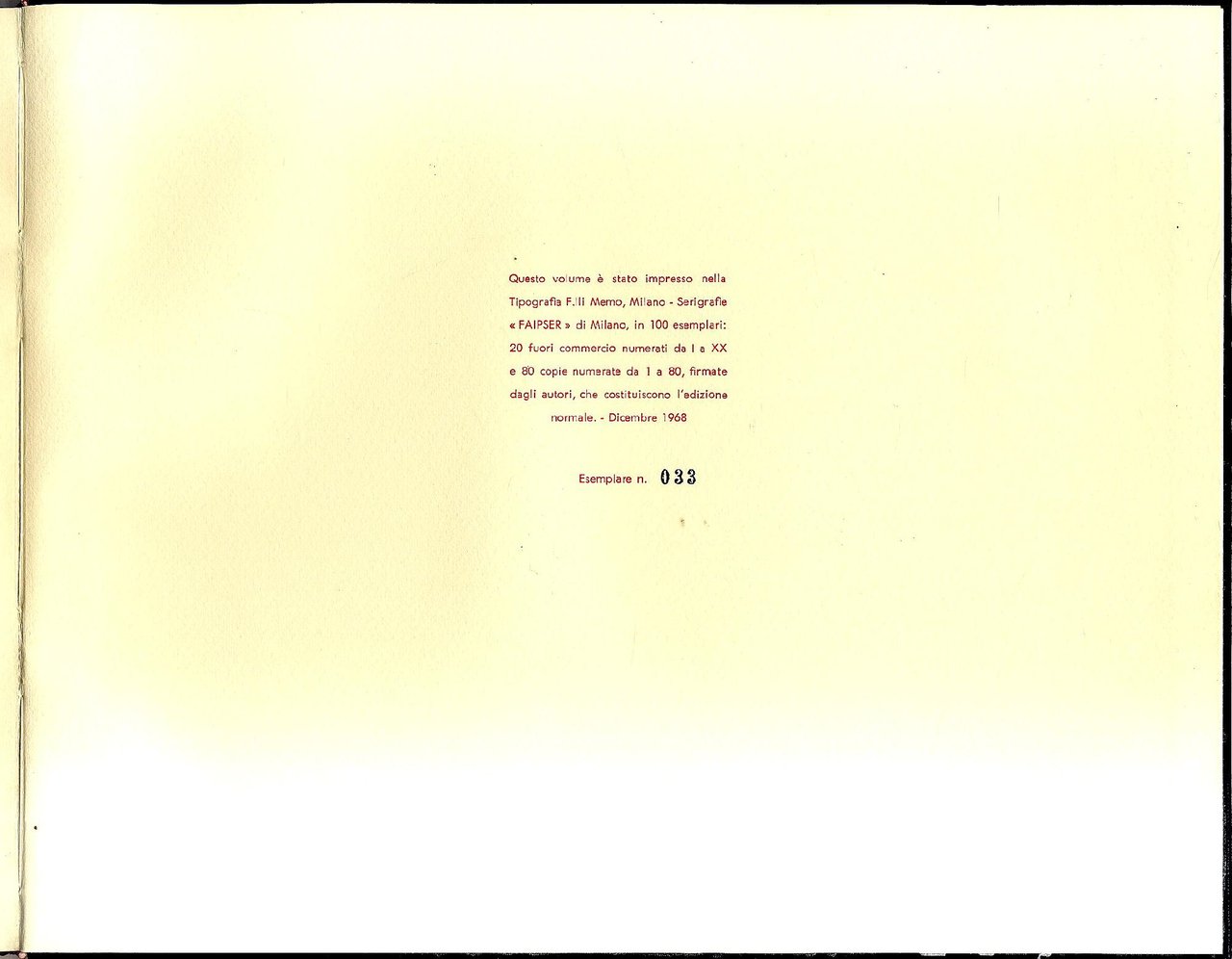 >album in-4 oblungo, cc. 23 di cui 6 con serigrafie originali di Foschi applicate, ciascuna numerata e firmata; legatura editoriale in pelle nera, titolo in oro al dorso e al piatto anteriore, astuccio editoriale rosso. Prima ed unica edizione, tirata su carta forte ed impressa in soli 100 esemplari fuori commercio (ns. 33), firmati dall'autore. Lelio Scanavini, poeta, saggista ed editore, nelle sue raccolte poetiche mostra una particolare attenzione al rapporto tra scrittura e arti visive che si evidenzia fin dalla sua prima opera, Sequenze rosso 1, in cui alerna a sei sue poesie, impresse in rosso e con gran cura tipografica, le sei serigrafie del pittore Adriano Foschi. Raro. Esemplare in perfetto stato.