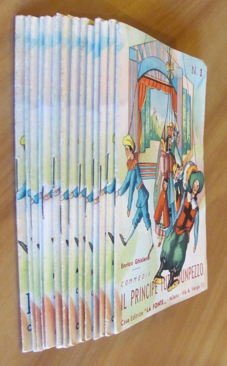 Serie 1/14 consecutivi. Commediole: 1 - Ghislandi E.: Il Principe Tuttodunpezzo; 2 - Martini L.: Una burla di Carnevale; 3 - Mauri L.: Come l'Orco diventò buono; 4 - Laurenti M.: La scarpa di Enrico; 5 - Sardano R.: La buona idea di Carlo; 6 - Bonelli A.: La reggia e la capanna; 7 - Lualdi A.: La Fata Bruna; 8 - Lombardi M.: Due birichinate provvidenziali; 9 - Origo A.: Frottolino Frottolone; 10 - Casati E.: La Reginetta Voglio; 11 - Tonelli L.: Cappuccetto Rosso; 12 - Tonelli L.: Cenerentola; 13 - Tonelli L.: Biancaneve e i sette nani; 14 - Tonelli L.: Pinocchio. Belle illustrazioni a colori alle copertine. Casa Editrice La Fonte - Milano, anni '50. Brossure editoriali spillate. 12x16,5; pagine da 12 a 48 ciascuno. Piccole Commedie Teatrali, molto Rare e in Ottimo stato. , Ottimo (Fine)