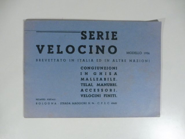 In 24 (cm 17 x 12), pp. 14 + (2). Brossura editoriale. Bel cataloghino illustrato relativo al 'velocino', modello di bicicletta ideato e costruito negli anni Trenta a Bologna costituito da una grande ruota posteriore e da una anteriore piu' piccola. Il passeggero e' seduto su un seggiolino e rimane in posizione seduta con il torso verticale, le braccia appoggiate lungo i fianchi con le mani che tengono un manubrio basso. Il catalogo procede ad una lunga disamina dei vantaggi del velocino rispetto alla bicicletta: per quanto riguarda la postura, l'uomo, in bicicletta, e' in posizione piu' instabile con il peso che grava sull'inguine e sulle braccia, la schiena piegata, i muscoli del collo tesi. La posizione che si assume alla guida del velocino e' piu' comoda e rilassata, e anche piu' decorosa e composta, cosa che lo rende adatto ad un numero maggiore di persone. Si puo' facilmente chiudere e mettere in macchina e portare anche a mano ripiegato in una sacca. Bello l'apparato iconografico fatto di illustrazioni e piccole foto in bianco/nero.