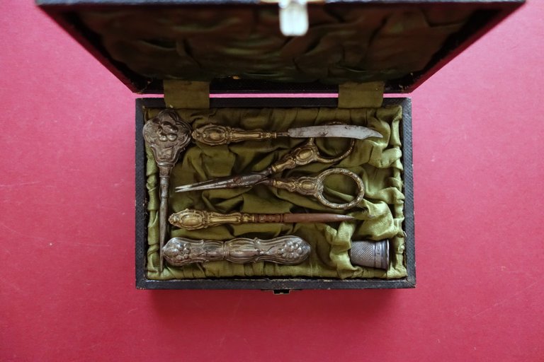 Servizio da Cucito in Foglia d'Argento 6 Pezzi Cofanetto Fine '800 Primi '900