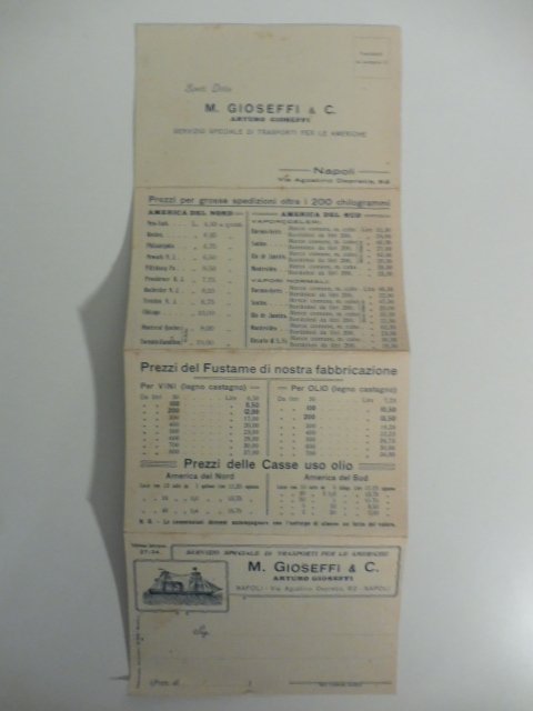 Pieghevole di 8 facciate con le tariffe per le spedizioni fino a 200 kg (e oltre) per l'America con le differenze di invio fra i vari stati americani. Compare inoltre il prezziario del fustame di produzione di questa ditta che si occupava principalmente di trasporto merci via mare per l'America da Napoli.