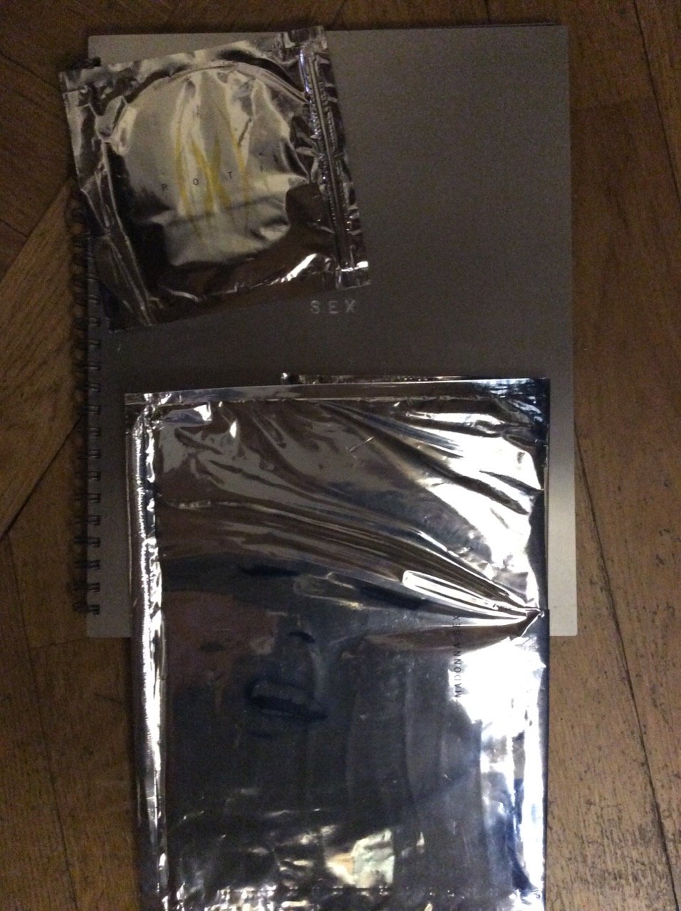 In-4 gr., legatura editoriale in alluminio con titolo inciso al piatto, dorso a spirale, pp. (136), interamente illustrato in bianco e nero e a colori da fotografie artistiche di carattere erotico, con al centro la cantante Madonna mentre da sfogo alle sue fantasie sessuali. Allegato un CD singolo, nella sua confezione argentata, che contiene una canzone di Madonna (Erotic). "Prima edizione italiana". Conservata anche la busta argentata che avvolge il libro. Ben conservato.
