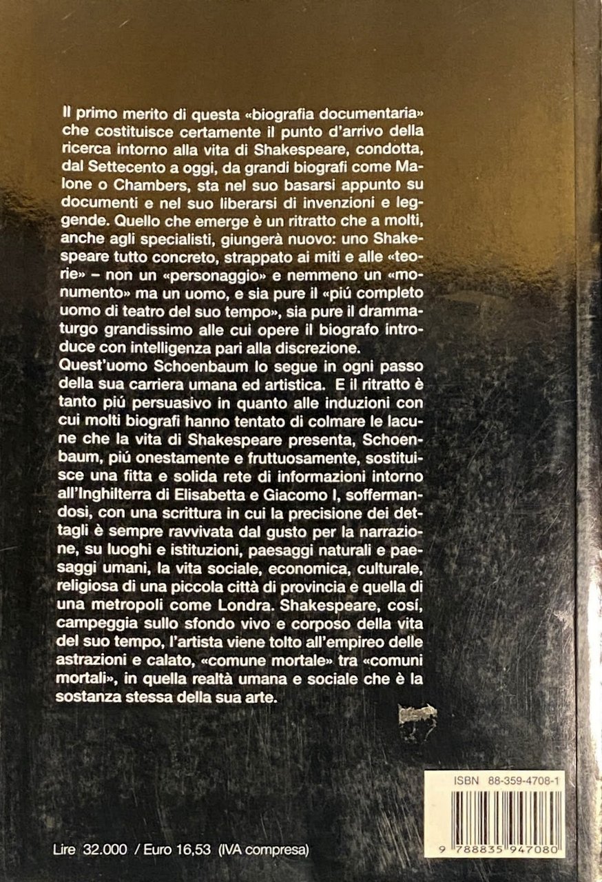 Il primo merito di questa biografia documentaria che costituisce certamente il punto d'arrivo della ricerca intorno alla vita di Shakespeare, condotta, dal Settecento a oggi, da grandi biografi come Malone o Chambers, sta nel suo basarsi appunto su documenti e nel suo liberarsi di invenzioni e leggende. Quello che emerge è un ritratto che a molti, anche agli specialisti, giungerà nuovo: uno Shakespeare tutto concreto, strappato ai miti e alle teorie -non un personaggio e nemmeno un monumento ma un uomo, e sia pure il più completo uomo di teatro del suo tempo, sia pure il drammaturgo grandissimo alle cui opere il biografo introduce con intelligenza pari alla discrezione. Quest'uomo Schoenbaum lo segue in ogni passo della sua carriera umana ed artistica. E il ritratto è tanto più persuasivo in quanto alle induzioni con cui molti biografi hanno tentato di colmare le lacune che la vita di Shakespeare presenta, Schoenbaum, più onestamente e fruttuosamente, sostituisce una fitta e solida rete di informazioni intorno all'Inghilterra di Elisabetta e Giacomo I, soffermandosi, con una scrittura in cui la precisione dei dettagli è sempre ravvivata dal gusto per la narrazione, su luoghi e istituzioni, paesaggi naturali e paesaggi umani, la vita sociale, economica, culturale, religiosa di una piccola città di provincia e quella di una metropoli come Londra. Shakespeare, così, campeggia sullo sfondo vivo e corposo della vita del suo tempo, l'artista viene tolto all'empireo delle astrazioni e calato, comune mortale tra comuni mortali, in quella realtà umana e sociale che è la sostanza stessa della sua arte.