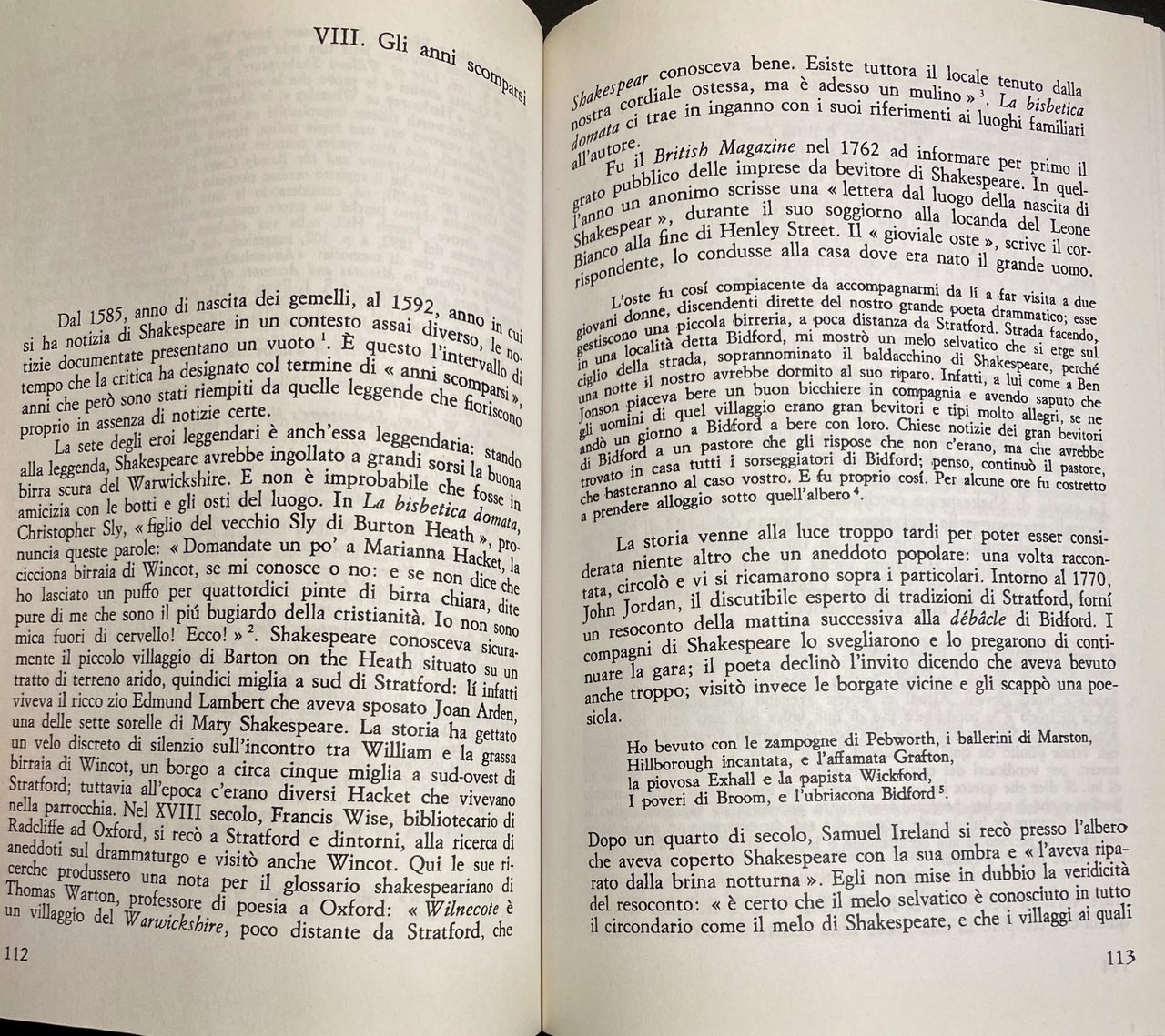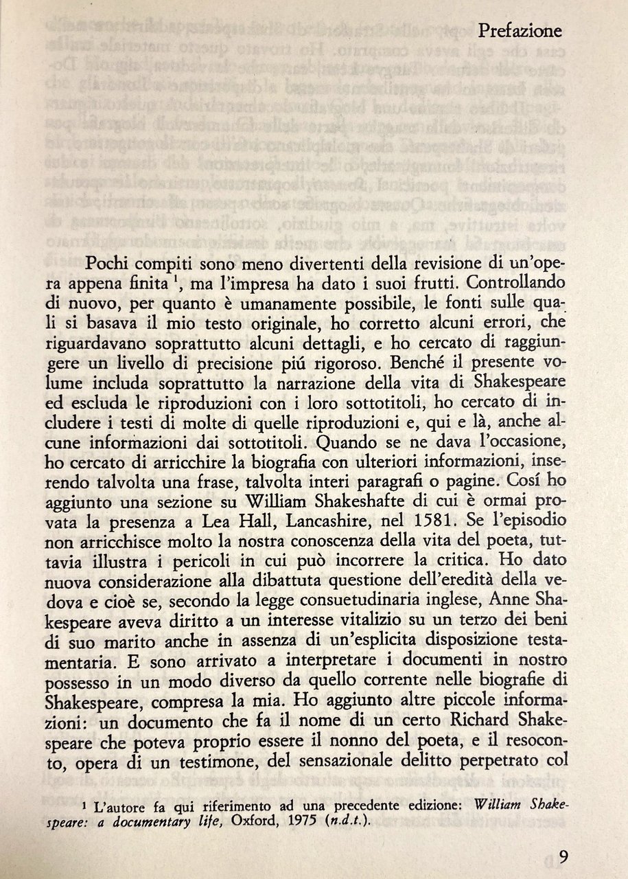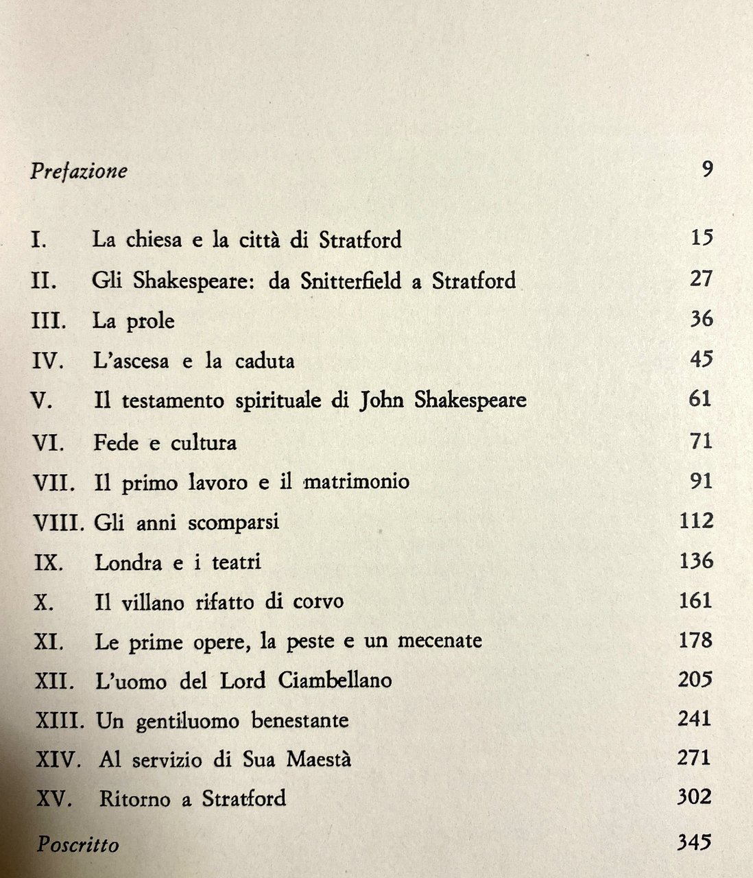 Soggetti: Biografie, Memorie, Teatro elisabettiano, Critica letteraria, Drammi, Drammaturgia, Testi teatrali, Letteratura inglese, Cultura anglosassone, Opere generali, Poesia, Studi culturali, Bibliografia, Riferimento, Collezionismo, Libri vintage fuori catalogo, Saggistica, Arti performative, Attori, Rappresentazione, Commedie, Tragedie, Classici, Vita, Documentari, Rinascimento, Umanesimo, Robert Greene Stratford-upon-Avon Testamento spirituale Lives Sonetti WH Ireland JP Collier AL Rowse Anne Biografo Birthplace Trust Records Blackfriars Bodleian Library British Burbage Chamberlain's Edmund Chambers Roland Lewis Mark Eccles Edgar Fripp Halliwell Phillips Quincy Adams Bentley Chapel Chiesa Clopton Combe Copia Commedia Corte Figlia Documenti Morte Edmond Malone Elizabeth Elisabettiana Inghilterra Folger First Folio George Steevens Globe Hall Henley Street Henry Holy Trinity James Johnson Re Londra Lucy Manoscritto Matrimonio Merry Wives Nicholas Rowe Registro parrocchiale Oxford Poesie Poeta Ufficio Registrazione pubblica Queen Quiney Luogo Nascita Trust Segnatura Sir Thomas Snitterfield Sonetti Spere Stage Stratford-upon-Avon Susanna Temple Grafton Testamento Frontespizio Titus Andronicus Warwickshire Welcombe Moglie Fonti Studi Thomas More Anthony Burgess Contratti Salisbury Compagnie teatrali Fede Peste Mecenatismo Bardolatria Macbeth Re Lear Amore Vendetta Mercante di Venezia Vita Richard Hathaway Tyler Robert Arden Webbe Amleto Cleopatra Otello Desdemona Romeo Giulietta Cesare Northrop Frye Hamnet Blackfriars Alla regina Identità Francis Bacon John Florio Volto Iconografia Rinascimento La tempesta Sogno di una notte di mezza estate Potere Donne Poetica Blank verse Christopher Marlowe Enjambement John Heminges Henry Condell Palcoscenico Fair friend Dark lady Venere e Adone Enrico VI La bisbetica domata Lord Ciambellano Tito Andronico Richard Burbage William Kempe Paul Ramsey Hays Hosley Linguaggio Pope Bibliotecario Manualetto Shakespeariano Gabriele Baldini Biographies, Memoirs, Elizabethan theatre, Literary criticism, Dramas, Dramaturgy, Theatrical texts English literature Anglo-Saxon culture General works Poetry Cultural studies Bibliography Reference Collecting Out of print books Non-fiction Performing arts Actors Performance Comedies Tragedies Classics Life Documentaries Renaissance Humanism Spiritual Testament Sonnets Biographer Church Copy Play Court Daughter Documents Death Elizabethan England London Manuscript Marriage Parish Register Poems Poet Office Public Record Shelf Mark Sonnets Testament Title Page Wife Sources Studies Contracts Theater Companies Faith Plague Patronage Bardolatry Love Revenge Merchant Venice Life Hamlet Othello Juliet Caesar To the Queen Identity Face Iconography Renaissance The Tempest A Midsummer Night's Dream Power Women Poetics Stage Venus and Adonis Henry VI The Taming of the Shrew Chamberlain Language Librarian Shakespearean Handbook