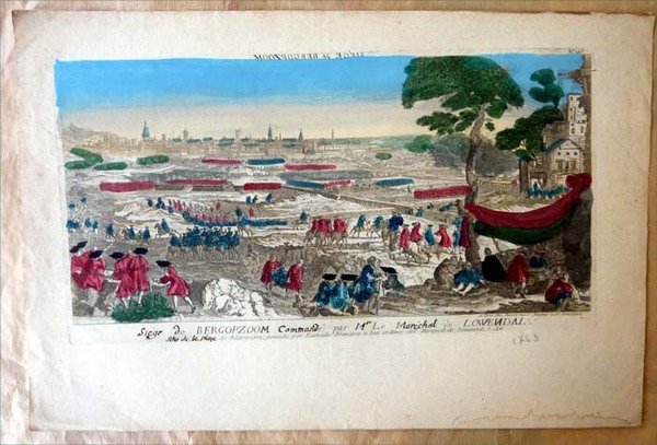 Une vue d'optique de dimensions 49x32 cm; représentant le siège de Bergopzoom en 1747 (et non 1622); coloris à la main. Mouillure en pied sans gravité; bel état. Voir la photo.