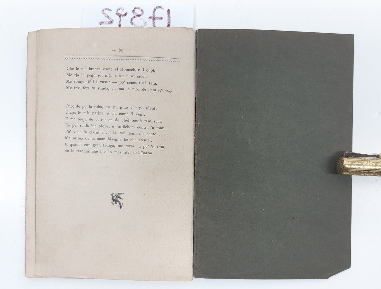 legatura morbida editoriale in discrete condizioni, abrasioni e pieghe in corrispondenza del dorso, una rottura di circa un centimetro al margine superiore tra piatto anteriore e dorso, quarta di copertina con una piega all'angolo inferiore, interno in condizioni accettabili, legatura vista a frontespizio, firma e dedica del vecchio proprietario, pagine leggermente brunite, legatura allentata, pagine 67-78 quasi staccate dal volume, numero pagine 80, dimensioni cm 16,7 * 10,9
