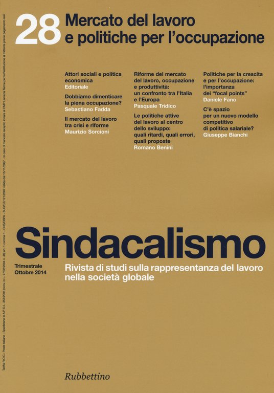 Sindacalismo la rivista di studi sulla rappresentanza del lavoro nella società globale. Una ricerca di dialogo e di confronto tra la ricerca scientifica internazionale, gli ambienti di studio, l'opinione pubblica, i soggetti sociali, gli operatori economici, i movimenti politici e le istituzioni del paese al fine di favorire una maggiore comprensione della realtà socio-economica che si sviluppa nei differenti livelli d'indirizzo di una società aperta, pluralista e democratica.