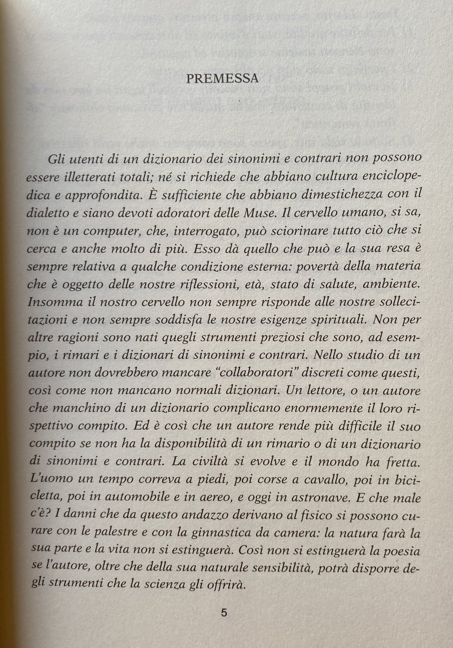 PREMESSA. Gli utenti di un dizionario dei sinonimi e contrari non possono essere illetterati totali; né si richiede che abbiano cultura enciclopedica e approfondita. È sufficiente che abbiano dimestichezza con il dialetto e siano devoti adoratori delle Muse. Il cervello umano, si sa, non è un computer, che, interrogato, può sciorinare tutto ciò che si cerca e anche molto di più. Esso dà quello che può e la sua resa è sempre relativa a qualche condizione esterna: povertà della materia che è oggetto delle nostre riflessioni, età, stato di salute, ambiente. Insomma il nostro cervello non sempre risponde alle nostre sollecitazioni e non sempre soddisfa le nostre esigenze spirituali. Non per altre ragioni sono nati quegli strumenti preziosi che sono, ad esempio, i rimari e i dizionari di sinonimi e contrari. Nello studio di un autore non dovrebbero mancare collaboratori discreti come questi, così come non mancano normali dizionari. Un lettore, o un autore che manchino di un dizionario complicano enormemente il loro rispettivo compito. Ed è così che un autore rende più difficile il suo compito se non ha la disponibilità di un rimario o di un dizionario di sinonimi e contrari. La civiltà si evolve e il mondo ha fretta. L'uomo un tempo correva a piedi, poi corse a cavallo, poi in bicicletta, poi in automobile e in aereo, e oggi in astronave. E che male c'è? I danni che da questo andazzo derivano al fisico si possono curare con le palestre e con la ginnastica da camera: la natura farà la sua parte e la vita non si estinguerà. Così non si estinguerà la poesia se l'autore, oltre che della sua naturale sensibilità, potrà disporre degli strumenti che la scienza gli offrirà.
