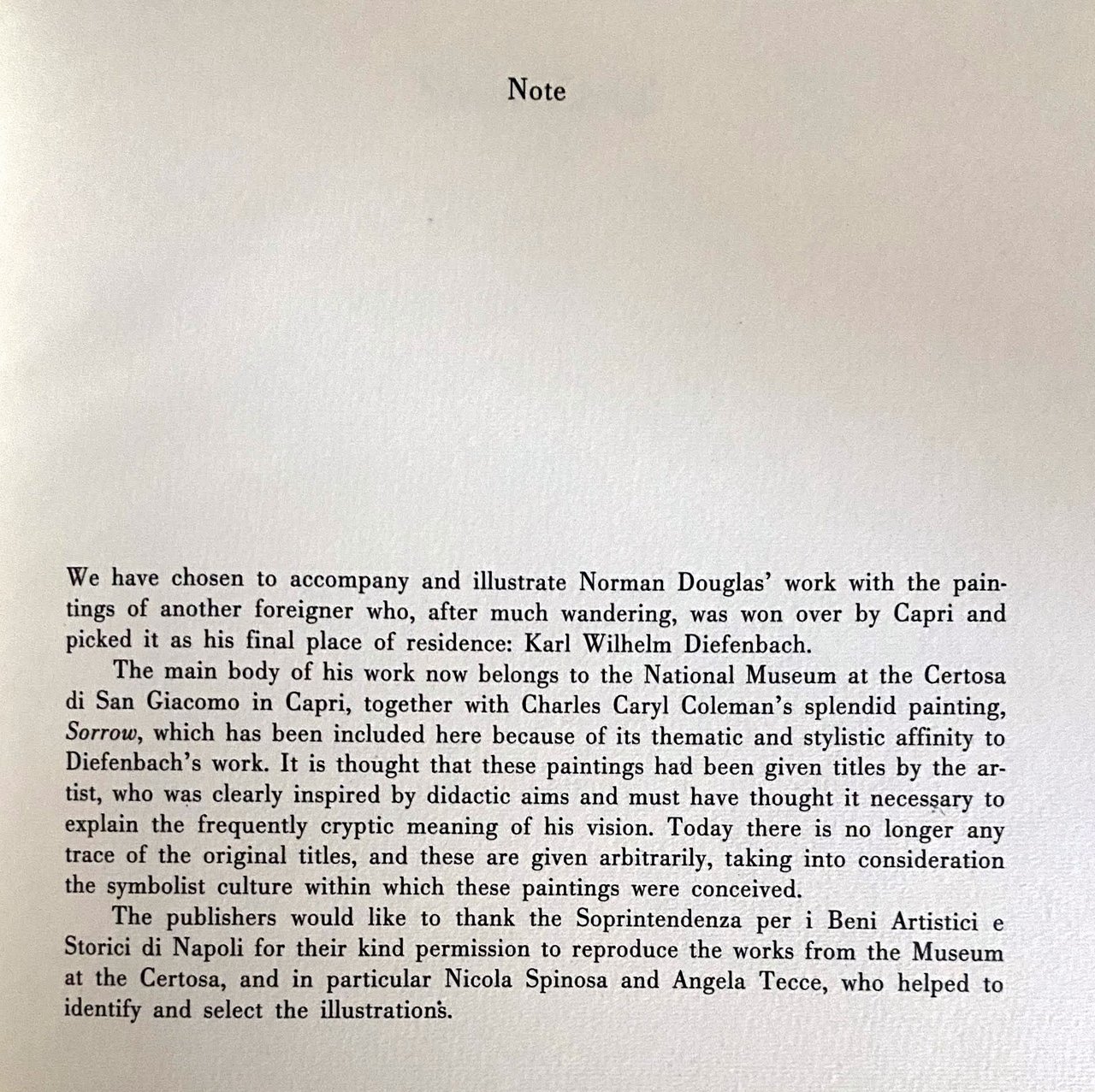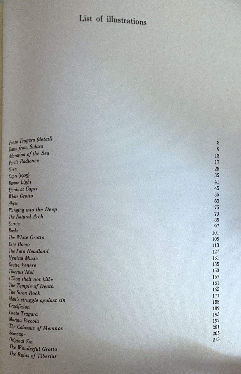 Soggetti: Viaggio Letteratura Classici Vento del Sud Fotografie Immagini Napoli South Wind Quaderni Normyx Fountains in the Sand Calabria Italia meridionale Costiera Sorrentina Sorrento Minerva Grotta Blu Villa Tiberio Ville Isole Mare Sirene Venere Dèi Mitologia classica greca Greci Romani Origini Storia Sirene Simbolismo Punta Tragara Mar Mediterraneo Tirreno Capri Marina Piccola Panorami Faraglioni Fiordi Arco Naturale Eolie Sicilia Chiese Risorse naturali Karl Wilhelm Diefenbach Charles Caryl Coleman's painting San Giacomo Hotel Palma 1911 Tiberius Bay of Naples Coast Punta Campanella Massa Lubrense Libri illustrati Pittura Arte Grand Tour Amalfitana Tour Turismo Agata Amalfi Anacapri Ancient Artist Beast Beauty Blue Grotto Cave Caverns Charm Christian Churches Colour Convent Marina Crapolla Death Devil Divine Don Pasquale Dreamearth Mythology Evil Eyes Familiar Friends Galli Gods Greece Greek Green Heart Hellenic Ischia Islet Italian Italy John Procida Legend Leisure Leucothea Limestone Marble Massa Mediaeval Mithra Modern Monks Mother Naples Natives Nature Neapolitan Nerano Nowadays Parthenope Priests Regions Religious Rocks Roman Saint Pantaleone Saint Teresa San Costanzo Sister Serafina Sorrentine peninsula Spirit Spot Stone Strange Suetonius Summer Tacitus Temple Tiberius Truth village Waves Wine Collezionismo Edizioni pregiate da collezione Libri rari fuori catalogo Fotografia Rarità Philosophy Hills Rain Bibliografia Riferimento Studi culturali Bibliography References Cultural studies Genealogia Luoghi Persone Guide letterarie Seascape Tragara Rovine Archeologia Monte Solaro Positano Certosa Nicola Spinosa Angela Tecce Pittura Pittori Disegni Museum Racconti Lipari Salina Visitare Vivara Isca August Kopisch Andersen Mayer Dolce vita Dolce far niente Ozio Scrittori inglesi Viaggiatori Ottocento Nepenthe Lucera Salento Calabria Basilicata Pino Orioli Graham Greene Elizabeth David Cucina Intellettuali anglosassoni Compton Mackenzie Edwin Cerio Descrizione Quaderno Ponza Footnote Raccolte Scritti in lingua Giuseppe Viggiani Nerano Martin Secker Saggi Insenature Santa Maria della Neve By the shore Ancestry Paesaggio Geologia Botanica Archeologia Mark Holloway Fountains in the Sand Posillipo Tacito Svetonio Ellenismo Magna Grecia Vino Localistica Genealogy Places People Literary guides Ruins Archaeology Charterhouse Painting Painters Drawings Stories Visiting Dolce vita Dolce far niente Idleness English writers Travellers Nineteenth century Cuisine Anglo-Saxon intellectuals Description Notebook Collections Writings Foreign languages Essays Inlets Landscape Geology Botany Archaeology Hellenism Localistics Out of print Books Collectibles Botanics Fauna Flora Grotta Blu Faraglioni Stories