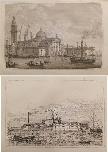 in-8, pp. 136, leg. post. m. tela. Con 14 belle tavv. litogr. protette da veline raffiguranti le isole della laguna veneziana, accompagnate da testi descrittivi di vari autori: Leopoldo Cicognara, Bartolomeo Gamba, Agostino Sagredo, Andrea Mustoxidi, Emilio De Tipaldo, Giovanni Veludo, e altri. Gli incisori sono Caterina Lose, Marco Comirato, Rocco Annibale, Giovanni Bernardini, su disegni per lo più di Pietro Chevalier. Prima edizione rara. Un lieve alone diffuso . [071]
