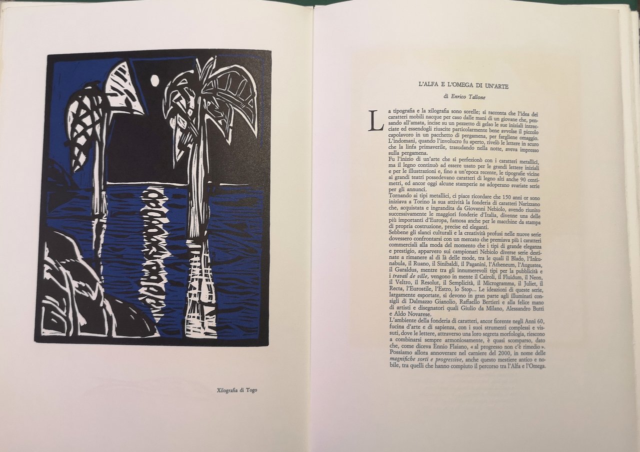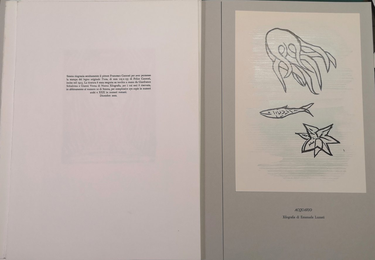 >fascicolo in-4 con 7 quartini sciolti raccoli da una copertina figurata. Impressi su carta a mano di Pescia. Tiratura di 270 esemplari num. in cifre arabe e 20 in numeri romani destinati agli autori dei testi (ns. 89 di 270). Testi di Marco De Carolis, Alan Dugan, Sergio Pent, Pino Mantovani, Alberto Sinigaglia, Enrico Tallone e altri. Con 19 xilografie originali in nero e a colori, anche a piena e doppia pagina, o su cartoncino applicato, di Eva Aulmann, Felice Casorati, Girolamo Ciulla, Ugo Giletta, Emanuele Luzzati. In questo numero figura anche una xilografia da legno originale del 1913 di Felice Casorati, Testa, eseguita su torchio a mano. Cfr. Nico Orengo. La tipografia come arte: "Con Smens Schialvino e Verna hanno recuperato uno spazio da tempo abbandonato nell'editoria di riviste, quello, antico, del rapporto scrittura-segno, e di un segno fatto di tecniche antiche e nobili”. Perfetto esemplare.